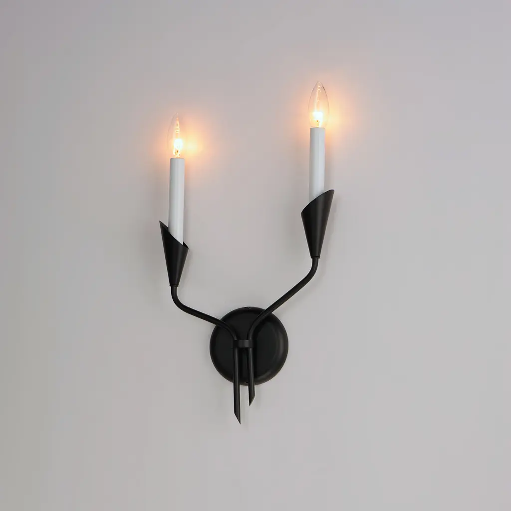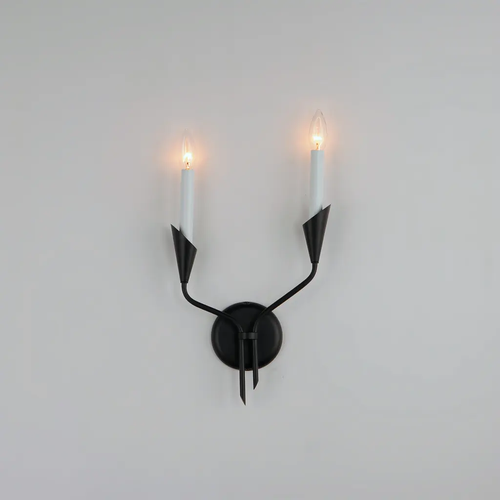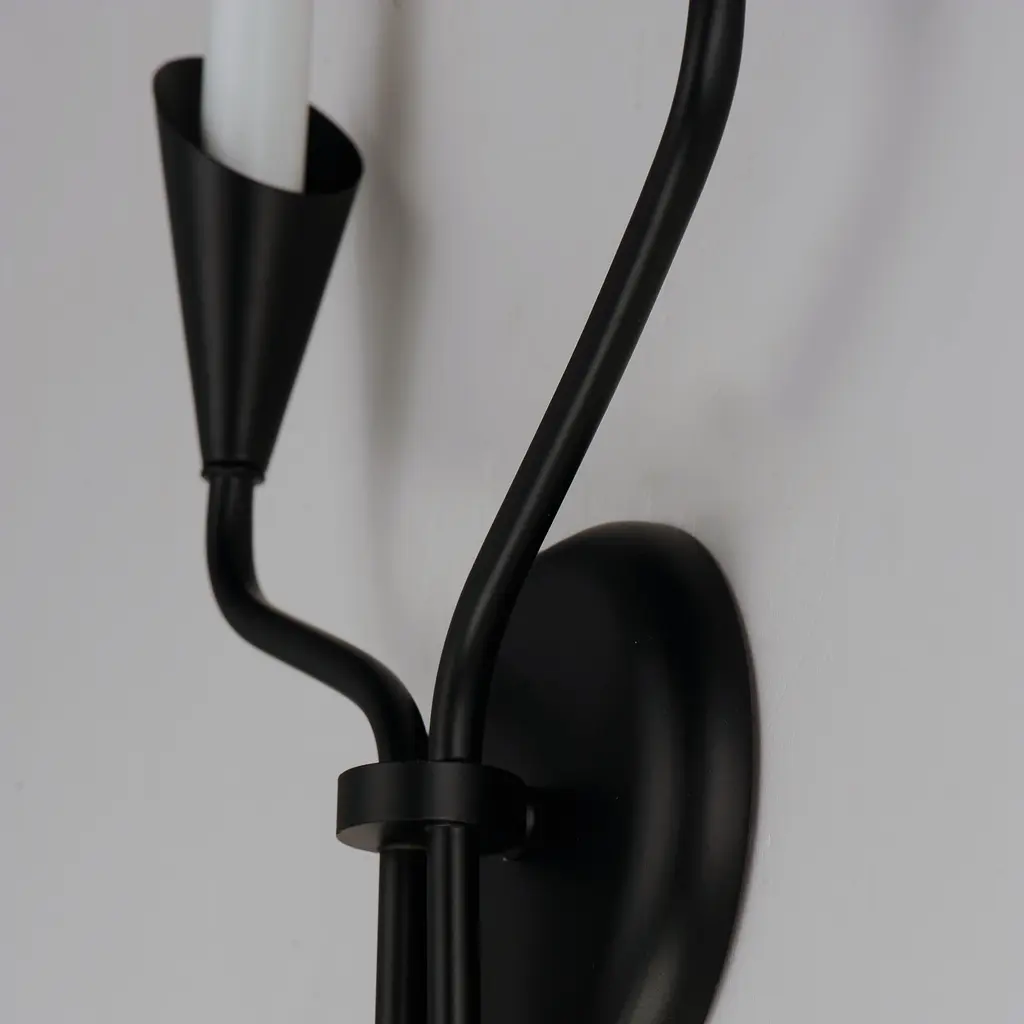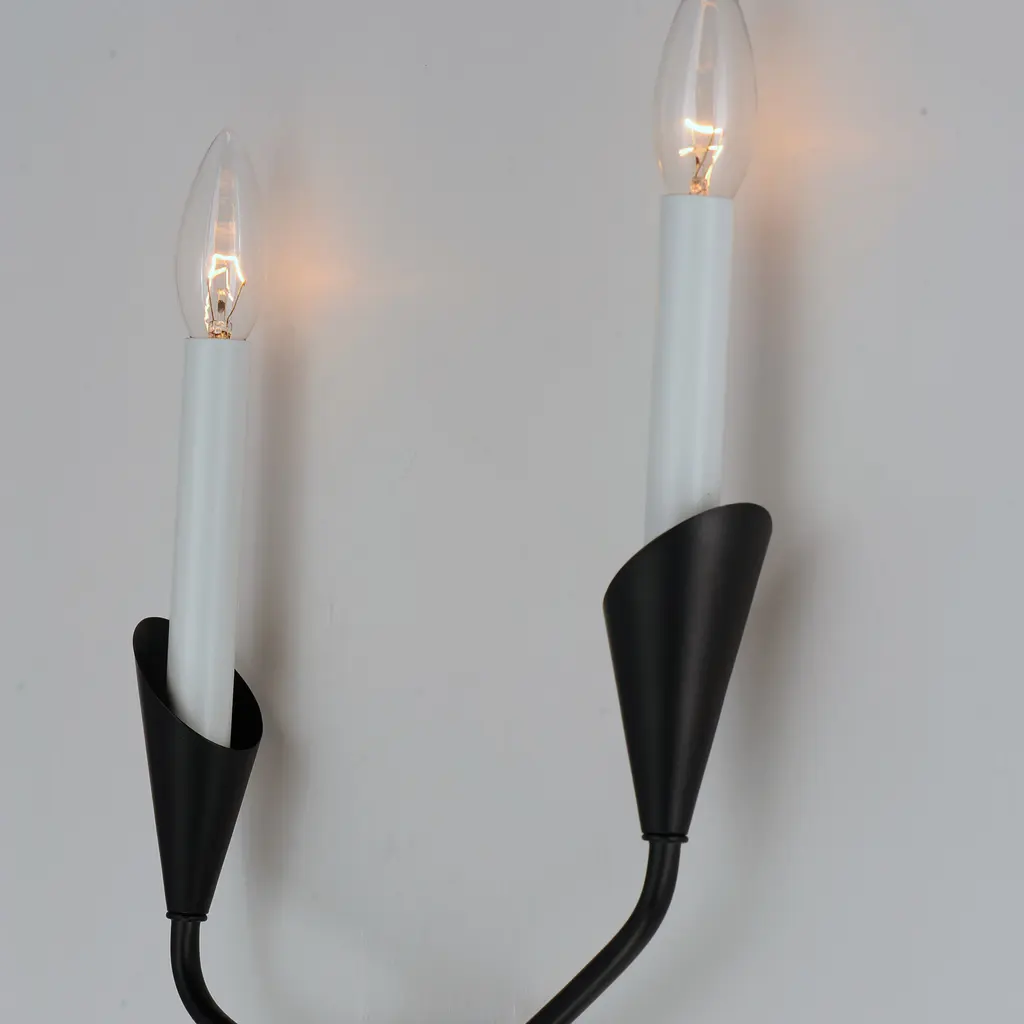 An arrangement that features Black tubing bouqueted at a point with biotic bobeches that contain elongated white candle covers. The organic form of this collection brings visual interest to the collector that is constructed of irregular stem lengths. The tailored composition of the look with its formal black and white finishes is elevated by its reference to nature. Added designer detail perfectly suited for any interior space. An accompanying ADA compliant wall sconce presents a unique option for corridor applications.