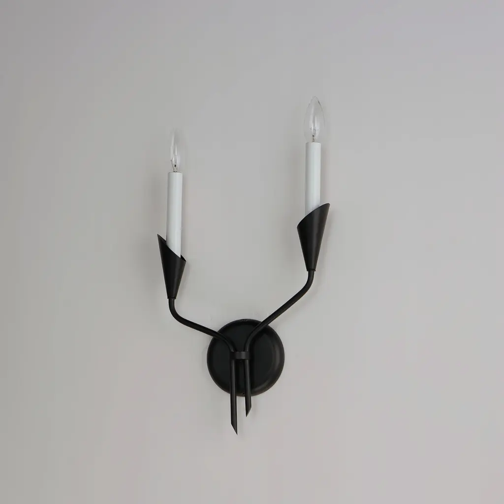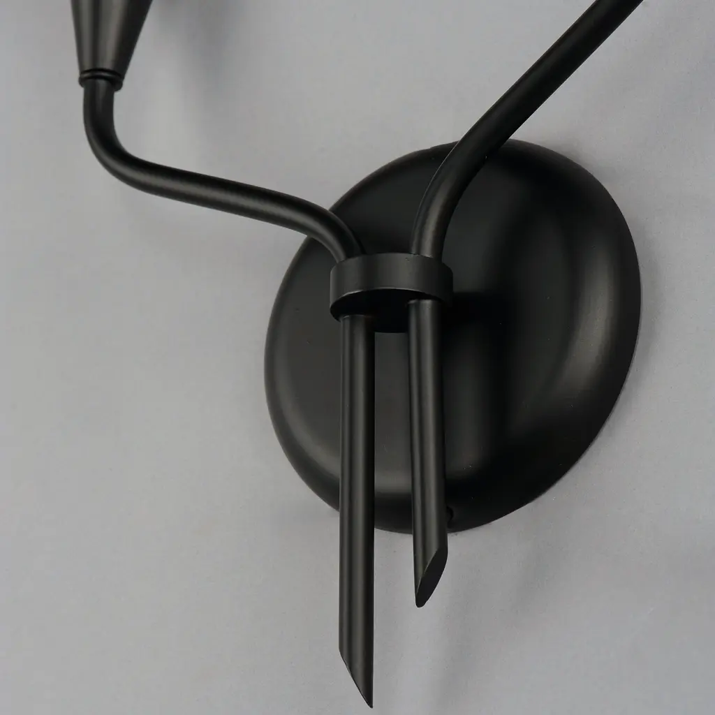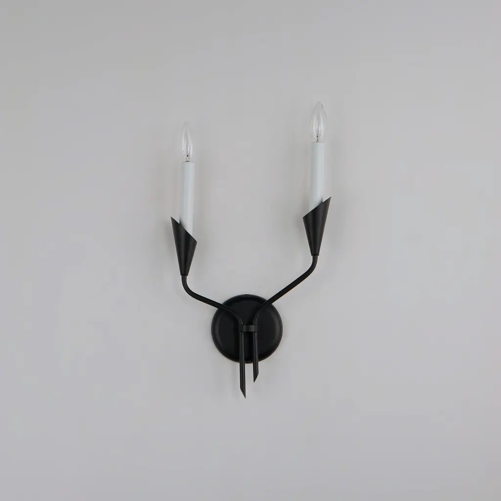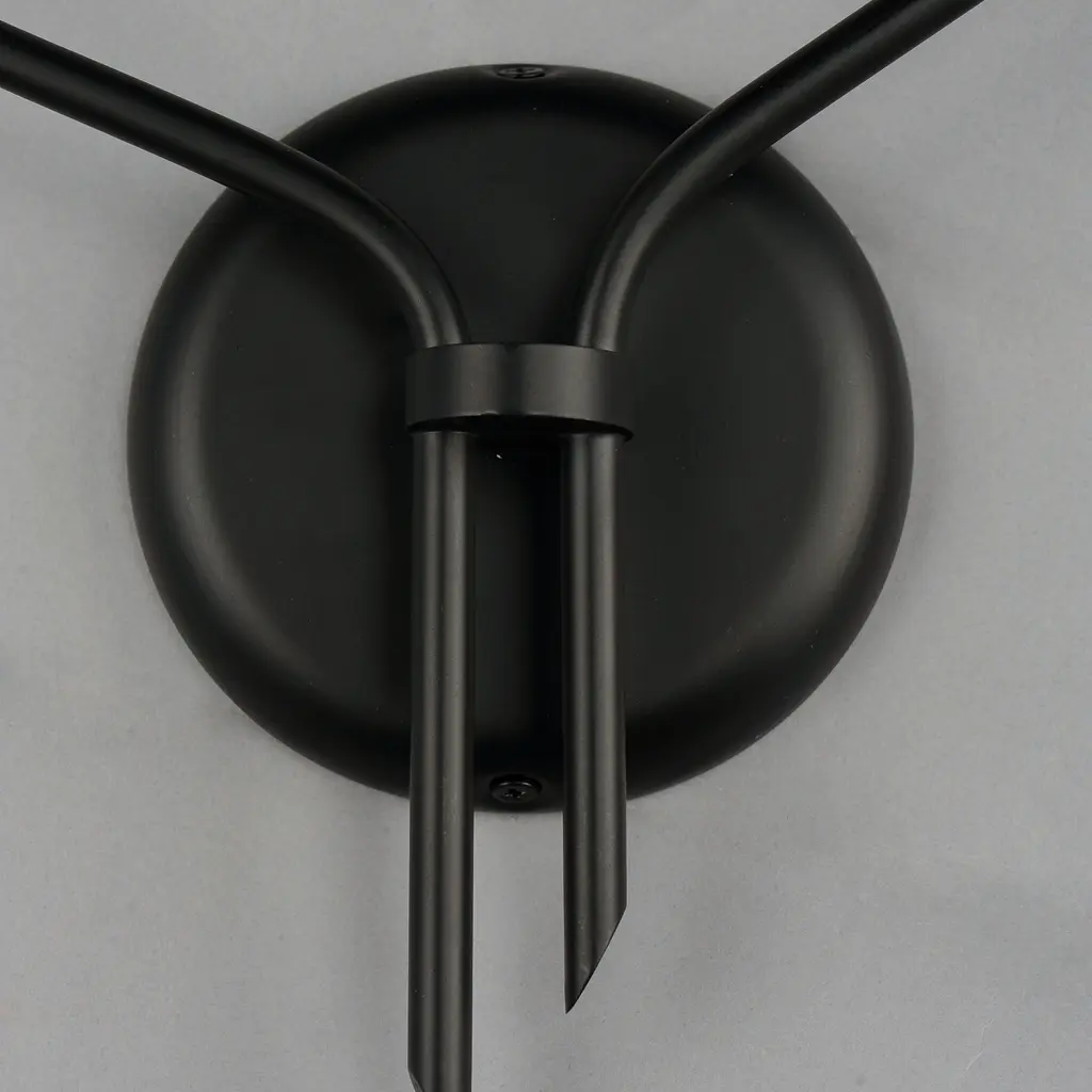 An arrangement that features Black tubing bouqueted at a point with biotic bobeches that contain elongated white candle covers. The organic form of this collection brings visual interest to the collector that is constructed of irregular stem lengths. The tailored composition of the look with its formal black and white finishes is elevated by its reference to nature. Added designer detail perfectly suited for any interior space. An accompanying ADA compliant wall sconce presents a unique option for corridor applications.