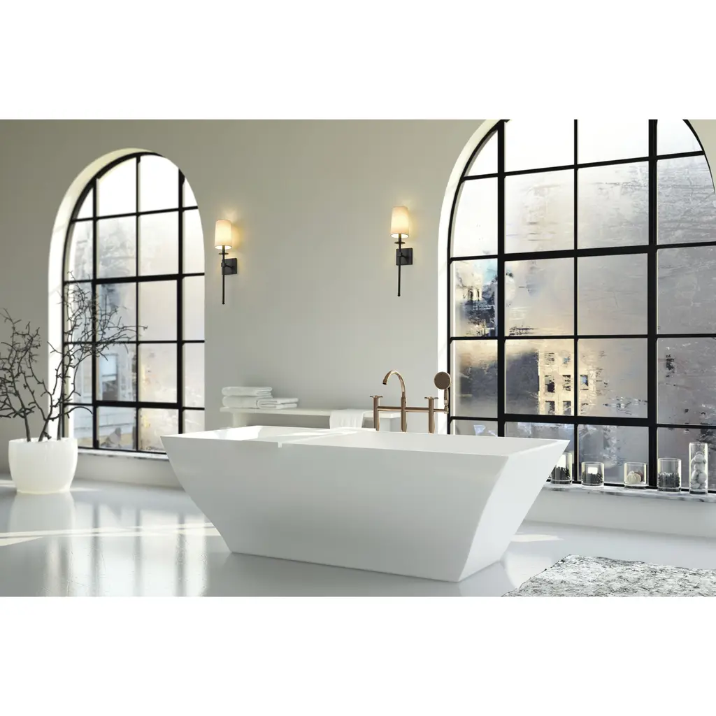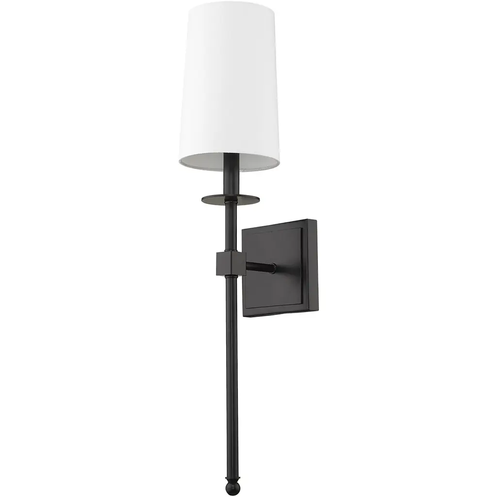 Long lines and an elegantly simple motif lend sophistication to this contemporary matte black finish one-light wall sconce. Mirroring a traditional lamp motif, its steel frame and wall mount join a tall white fabric shade to form a decadent look with versatility for use in a bathroom, bedroom, or hallway.