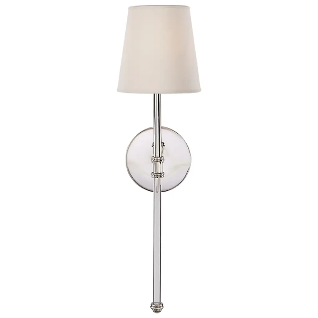 The Visual Comfort Signature, formerly known as Visual Comfort, Camille Sconce adds a layer of refined aesthetic to interior walls and hallways, making a once bland space into a polished interior. The archetypal torch shape is defined by its linen drum shade which, once lit, provides a soft glowing light that fills the space. A sleek metal holder mounts by a round wall plate, while its crystal clear extension refracts the warm glowing lights from above. Install the Camille Sconce as the picturesque beauty that takes your interior to a whole new level.