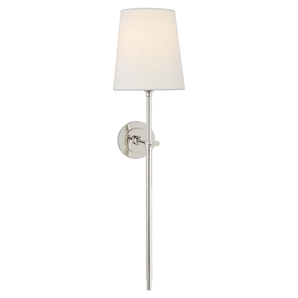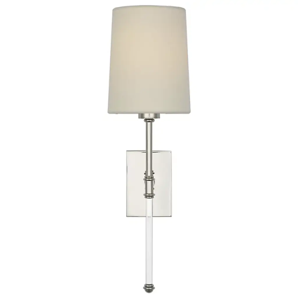The Visual Comfort Signature, formerly known as Visual Comfort, Camille Sconce adds a layer of refined aesthetic to interior walls and hallways, making a once bland space into a polished interior. The archetypal torch shape is defined by its linen drum shade which, once lit, provides a soft glowing light that fills the space. A sleek metal holder mounts by a round wall plate, while its crystal clear extension refracts the warm glowing lights from above. Install the Camille Sconce as the picturesque beauty that takes your interior to a whole new level.