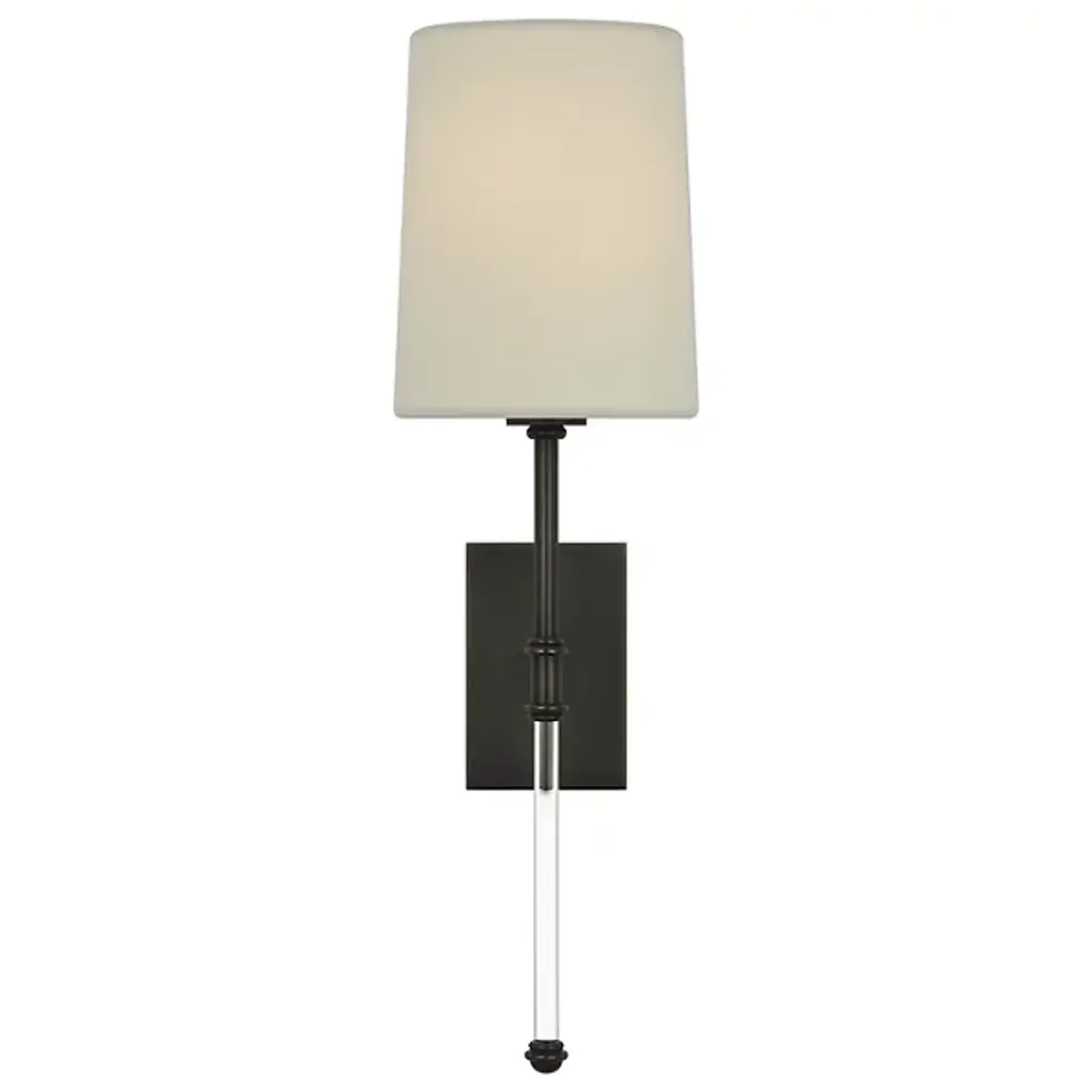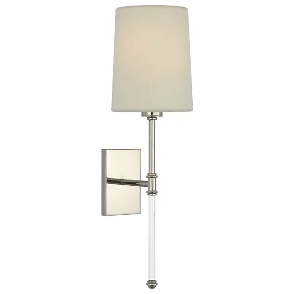The Camille Wall Sconce from Visual Comfort Signature balances minimalism with refined details that make a quiet statement in any room. Requiring a smaller outlet box for installation, this wall-mounted fixture exemplifies Suzanne Kasler's talent for creating lighting that enhances a space. The brass and acrylic materials play off each other, creating a pleasing contrast between warm and cool elements. Light filters through the carefully proportioned shade, casting a gentle glow that flatters its surroundings. This sconce works beautifully as a single installation or paired alongside mirrors, artwork, or doorways, where it provides purposeful lighting with understated appeal.
