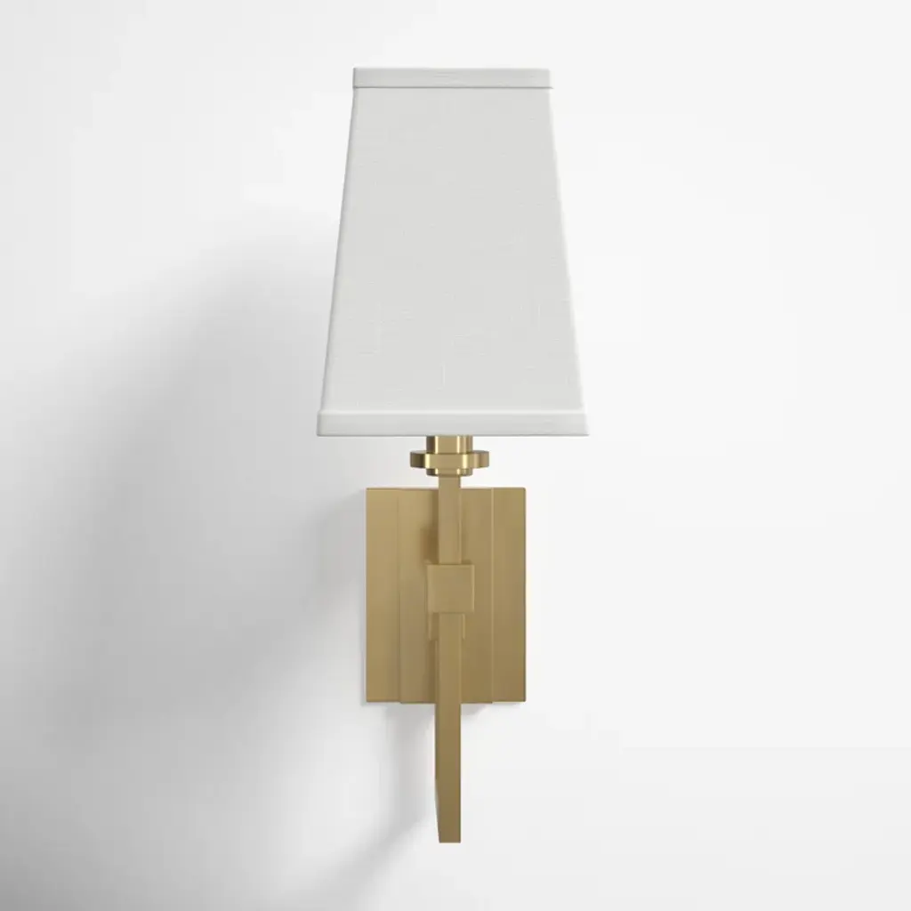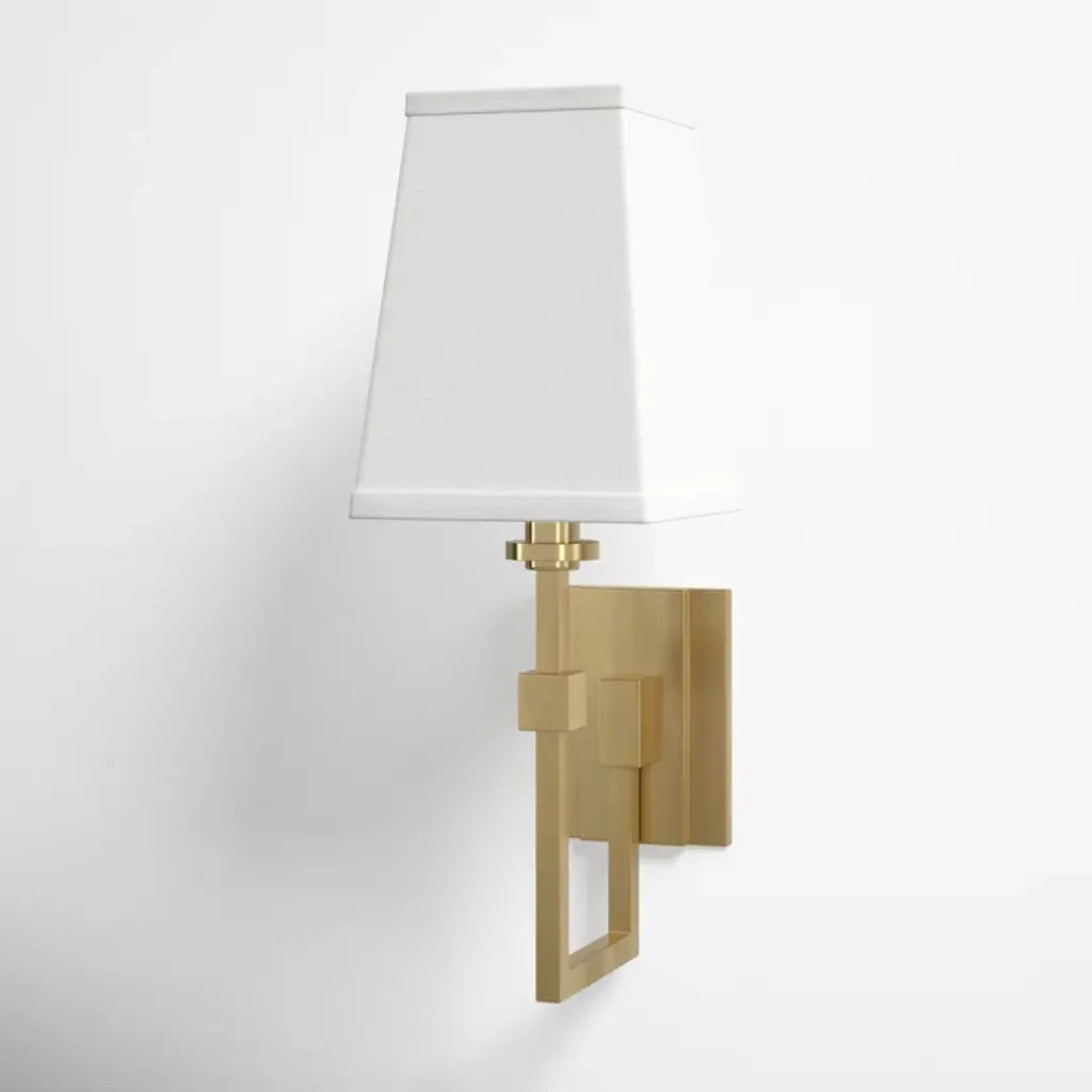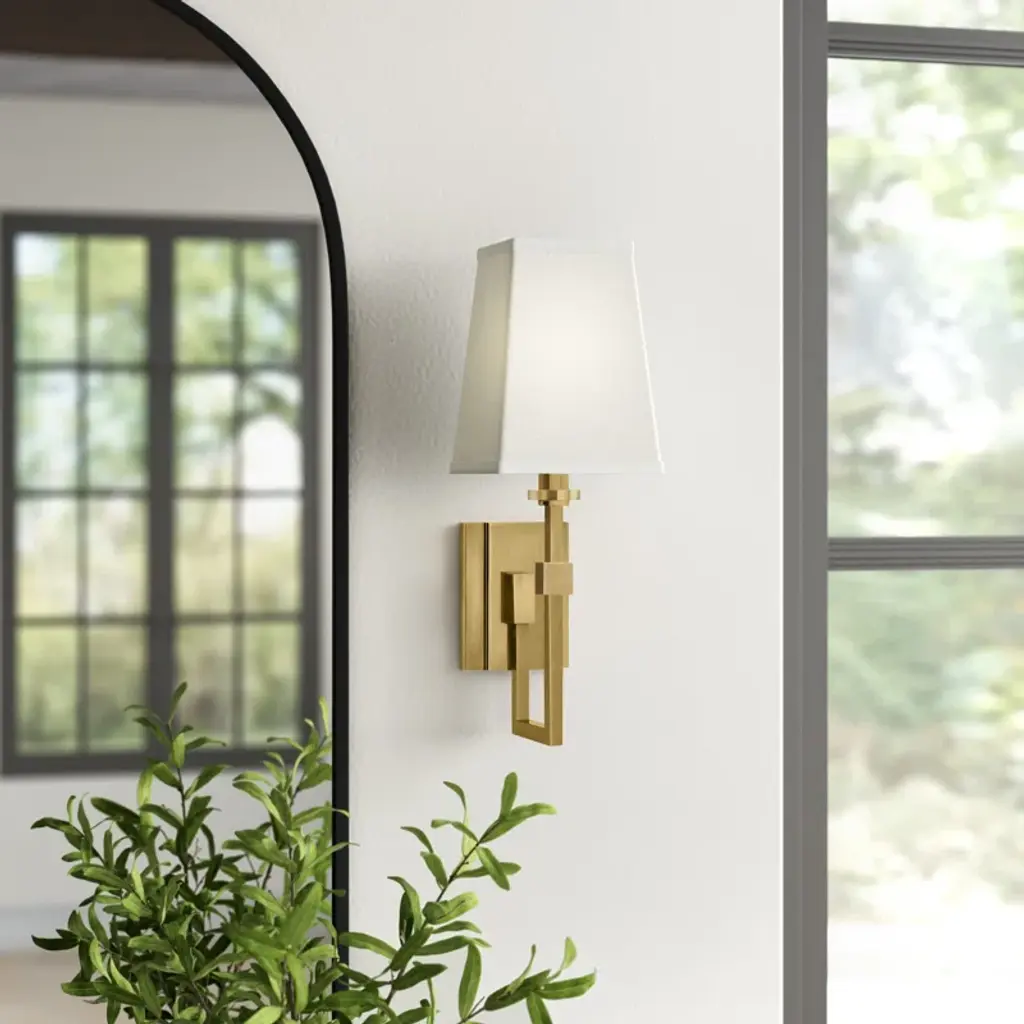 This armed sconce has a sleek, clean-lined design that's made to complement spaces of all styles. It's made from metal and mounted on a circular backplate with a curvy, angular support arm in a shiny finish. Up top, the white hardback shade adds a classic, tailored touch. Inside the shade, this hardwired fixture accommodates a single 60W candelabra-base bulb (sold separately). Best of all, it's safe to use in damp locations, so it's a great choice for adding ambiance to a covered porch or patio or a cozy glow to your bathroom.