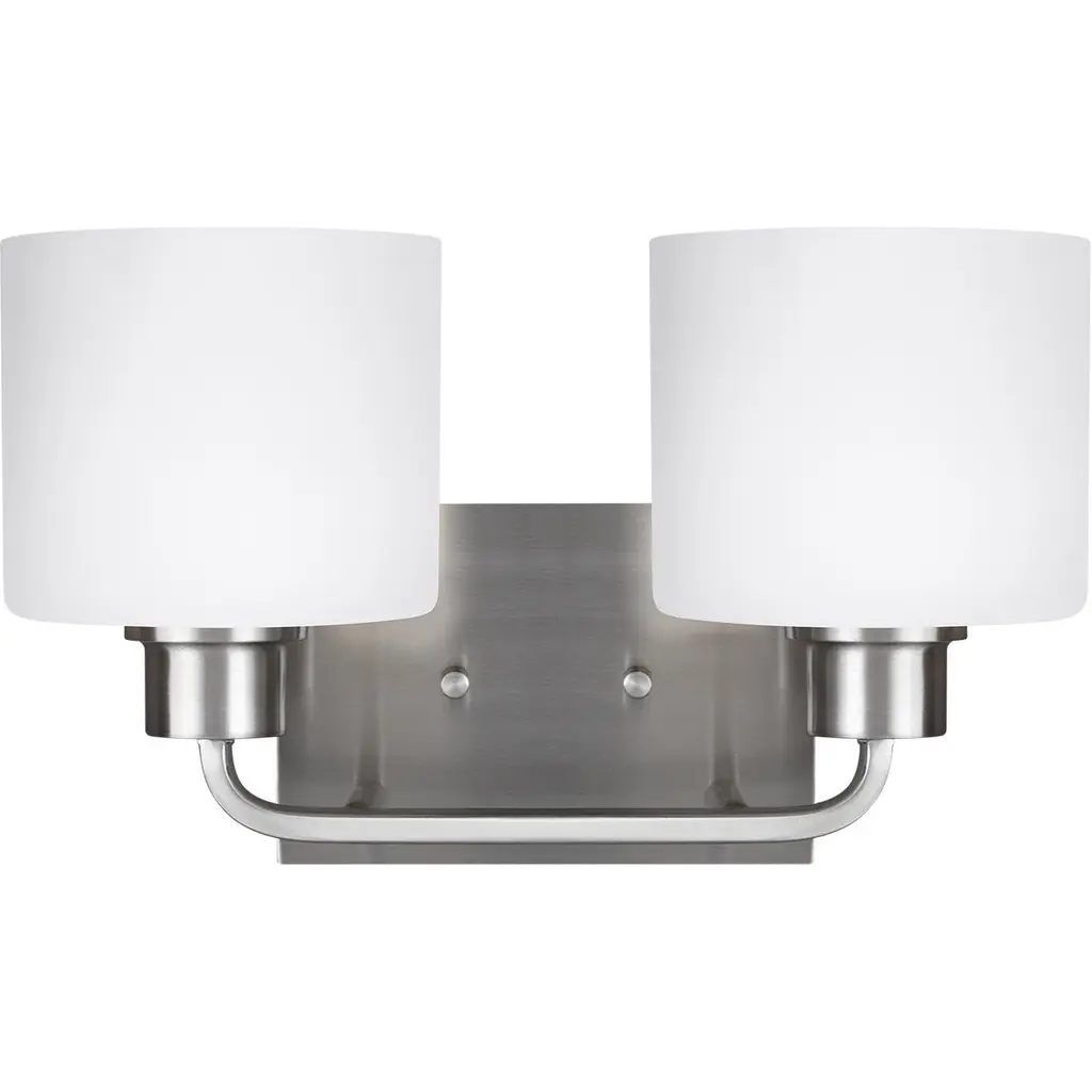 The Generation Lighting Lighting Canfield two light vanity fixture in brushed nickel provides abundant light for your bath vanity, while adding a layer of today''s style to your interior design. Behind every seemingly simple design lies unerring attention to restraint and obsessive attention to the tiniest details. The Canfield collection by Generation Lighting Lighting draws on the modernist traditions of "less is more". Essential functional elements dictate the aesthetics, and clean lines prevail. Layers of intricately finished hand-brushed steel progress vertically to the soft glow of light diffused through finely etched glass diffusors. Canfield offers a "whole home" lighting solution; offering lighting in every imaginable category from the auspicious 15 light 3-tier chandelier, to the concise mini-pendant and one-light sconces. The collection is available in hand brushed Burnt Sienna for a warm, tactile, almost Craftsman design style, or a brushed nickel to emphasize the more architectural elements of your interior.Lighting Information:Bulb type: 2 A19 Medium 100 watt light bulbsNumber of bulbs: 2Bulb(s) not includedcETL Listed