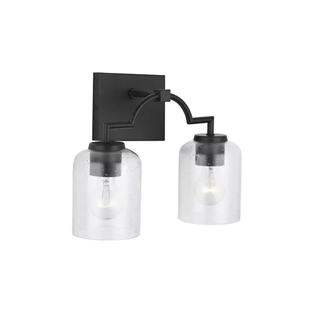 Designer details and clean lines dial up the drama with the Amara 2-Light Vanity. Thewrapped accent in a brass tone adds a layer of unexpected dimension and the Matte Black finish and seeded glass punctuates the personality of any bathroom. Also available in a 3-Light or 4-Light. DIMENSIONS: Overall: 14"W x 11.5"H x 7"E; Backplate: 5"W x 5"H x 1"E DETAILS: The tapered, wrapped-look accents are hand painted in a brass tone and paired with clear, seeded glass. FINISH: Matte Black is a neutral, dark, flat black, which is paired with a wrapped, textured brass accent. BULBS: Designed to be dimmable and LED/CFL/Incandescent bulb compatible, this fixture uses 2 - 100 Watt (max) E26 Medium base bulbs (not included). It's shown here with an A15 lamp. FEATURES: Rated for Damp locations; includes a 1-Year Manufacturer Warranty. Mounting Direction: Up or Down Back Plate Height: 5.00 Back Plate Width: 5.00 Shade Included: Yes Shade Dimensions: 5.25 x 5.75