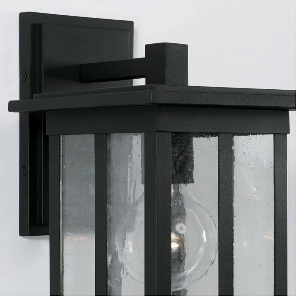 Clean lines and framed edges in the Barrett Collection give a graphic punch without being too overpowering. The textured water glass diffuses light and emits a warm glow for your porch or patio. These fixtures are part of our Rain or Shine Collection and are backed by our five-year warranty. APPLICATIONS: Rated for wet locations, perfect for a covered porch, portico, outdoor kitchen or walkway. Classic mission cues of strong vertical lines adorn this oiled bronze outdoor wall lantern EASY TO INSTALL: Replacing an existing fixture is easy with the included instructions and can be finished in as little as 15 minutes with a few simple hand tools. VERSATILE: Dimmable and LED/CFL/Incandescent compatible, uses one 100-Watt (max) E26 medium base bulb (Not Included) DIMENSIONS: 7 inchW x 12.25 inchH x 8.5 inchE RELIABLE: Includes 5-Year Rust and Fade Manufacturer's Warranty. Warranty: 5 Years rust and fade Room Recommendation: Outdoor Mounting Direction: Down Shade Included: Yes