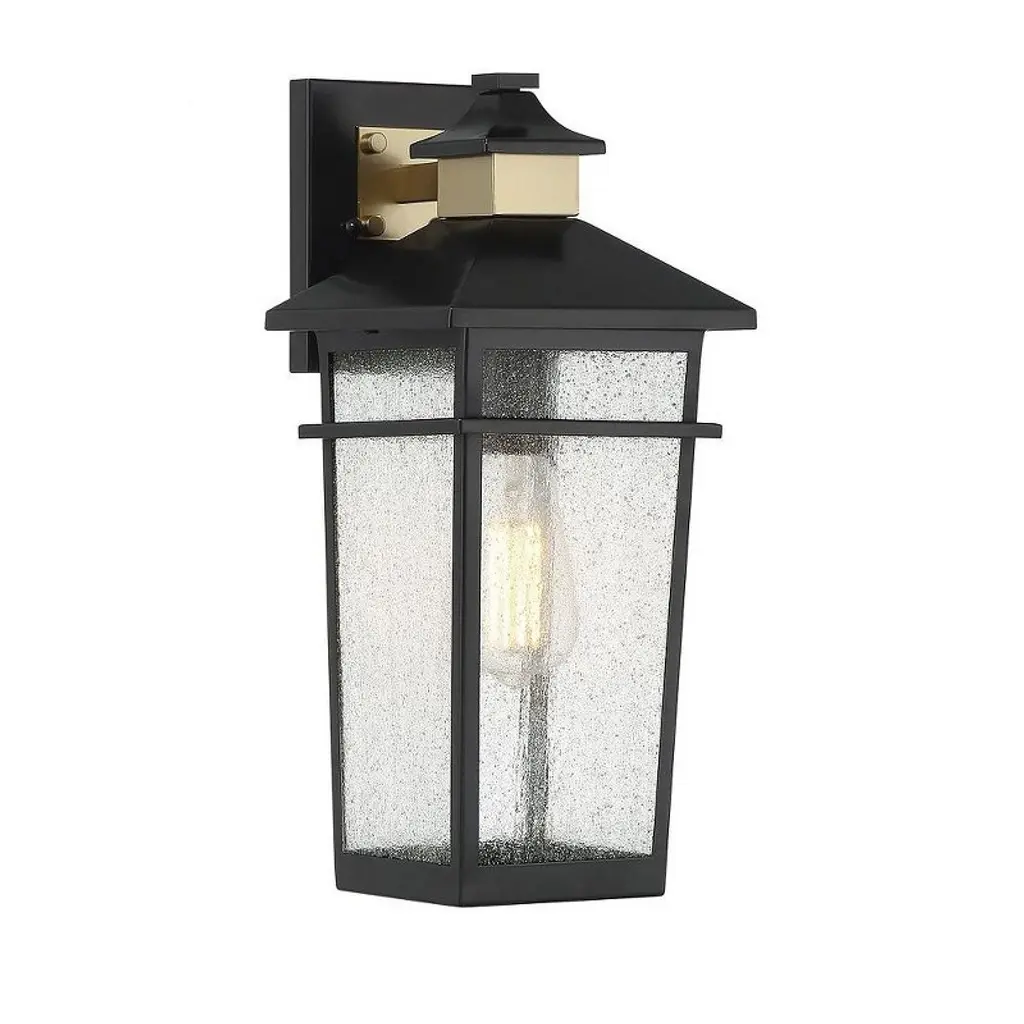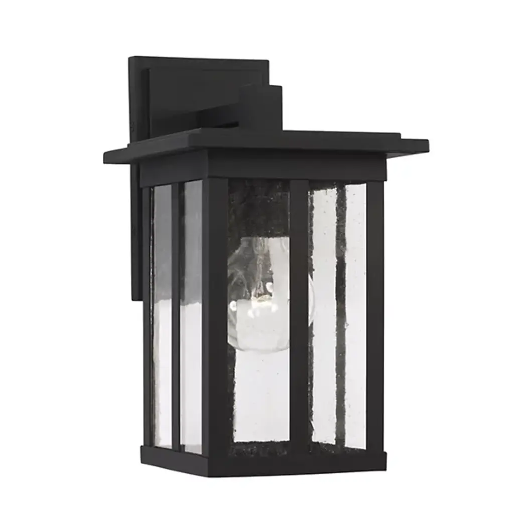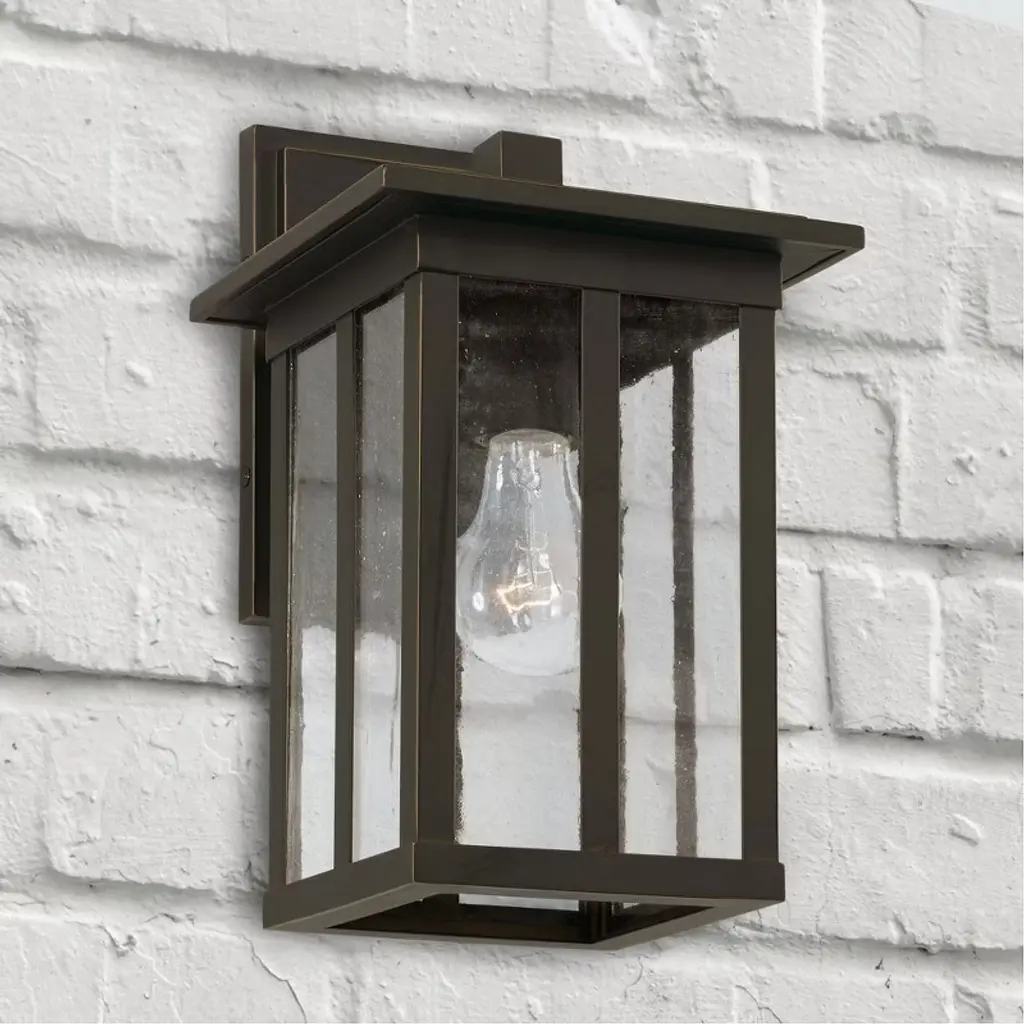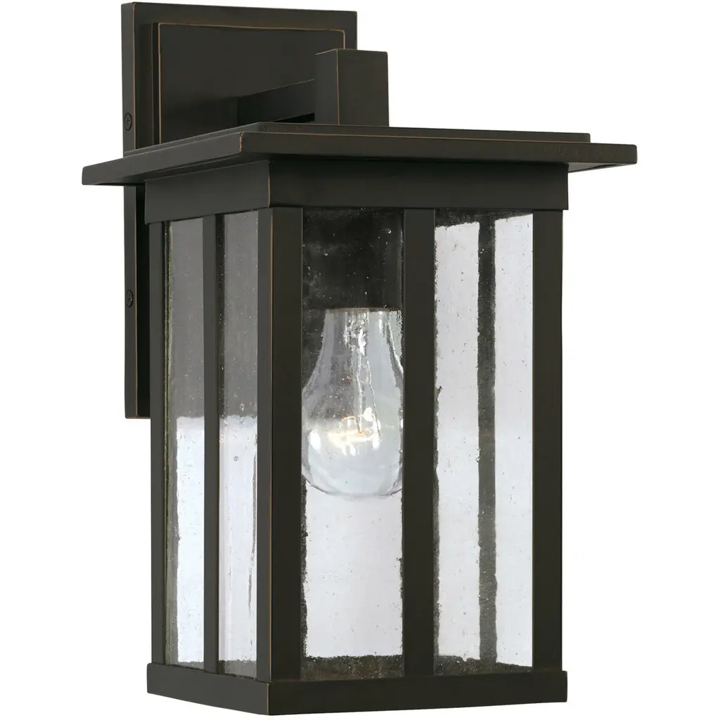 Clean lines and framed edges in the Barrett Collection give a graphic punch without being too overpowering. The textured water glass diffuses light and emits a warm glow for your porch or patio. These fixtures are part of our Rain or Shine Collection and are backed by our five-year warranty. APPLICATIONS: Rated for wet locations, perfect for a covered porch, portico, outdoor kitchen or walkway. Classic mission cues of strong vertical lines adorn this oiled bronze outdoor wall lantern EASY TO INSTALL: Replacing an existing fixture is easy with the included instructions and can be finished in as little as 15 minutes with a few simple hand tools. VERSATILE: Dimmable and LED/CFL/Incandescent compatible, uses one 100-Watt (max) E26 medium base bulb (Not Included) DIMENSIONS: 7 inchW x 12.25 inchH x 8.5 inchE RELIABLE: Includes 5-Year Rust and Fade Manufacturer's Warranty. Warranty: 5 Years rust and fade Room Recommendation: Outdoor Mounting Direction: Down Shade Included: Yes