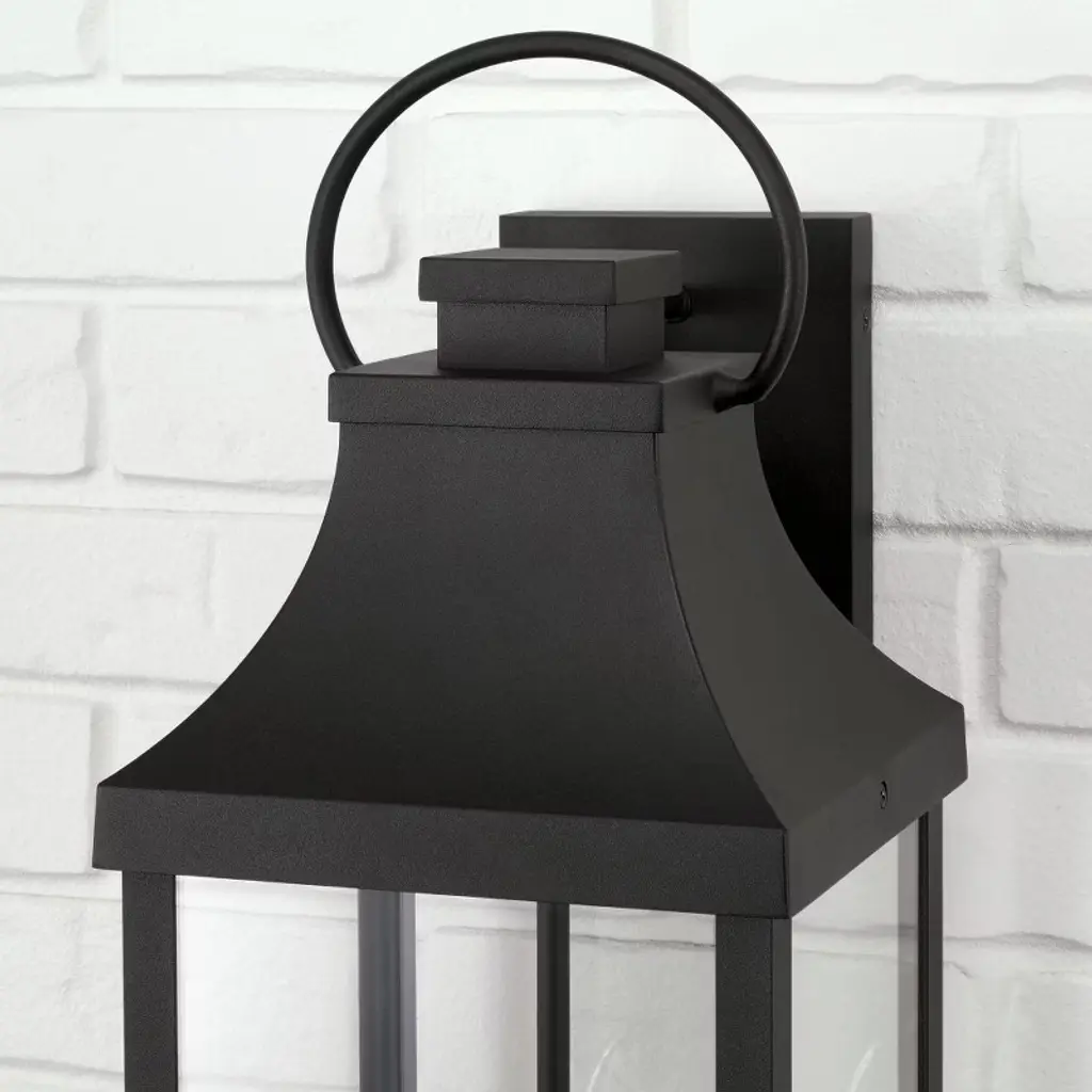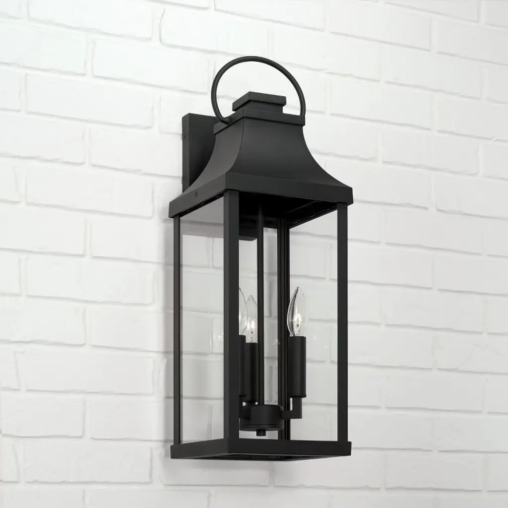 Transitional meets modern with the Bradford Large Wall Lantern. The bold lines and an oversized ring in a Black finish adds classic curb appeal to your home. Part of our Rain or Shine Collection and backed by our five-year warranty. DIMENSIONS: Overall: 8"W x 24"H x 9.75"E; Backplate: 4.75"W x 7.5"H x 1"E DETAILS: The tapered top and oversized ring paired with Clear Glass panels create a transitional and modern look. Bottom is open for easy access to bulb. FINISH: Part of the Rain or Shine series, the Black finish is a neutral, dark tone with a slightly coarse texture. BULBS: Designed to be dimmable and LED/CFL/Incandescent bulb compatible, this fixture uses 3 - 60 Watt (max) E12 Candelabra base bulbs (not included). It's shown here with a B10 lamp. FEATURES: Rated for Wet locations; includes a 5-Year Manufacturer Warranty Against Rust and Fading. Mounting Direction: Up Back Plate Height: 7.50 Back Plate Width: 4.75 Shade Included: Yes Shade Dimensions: 6.75 x 14.75