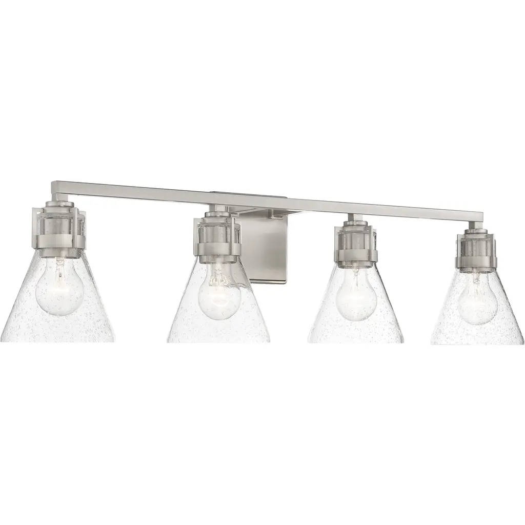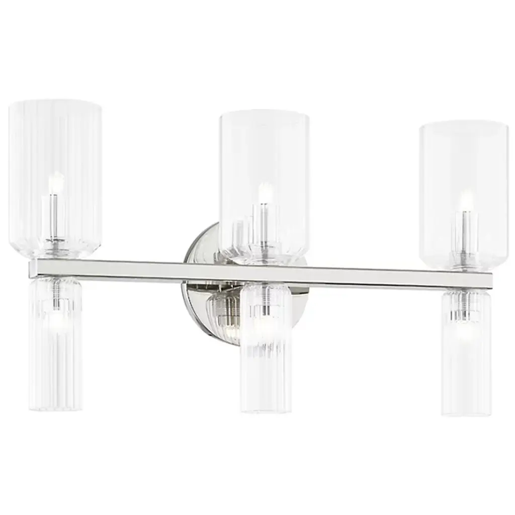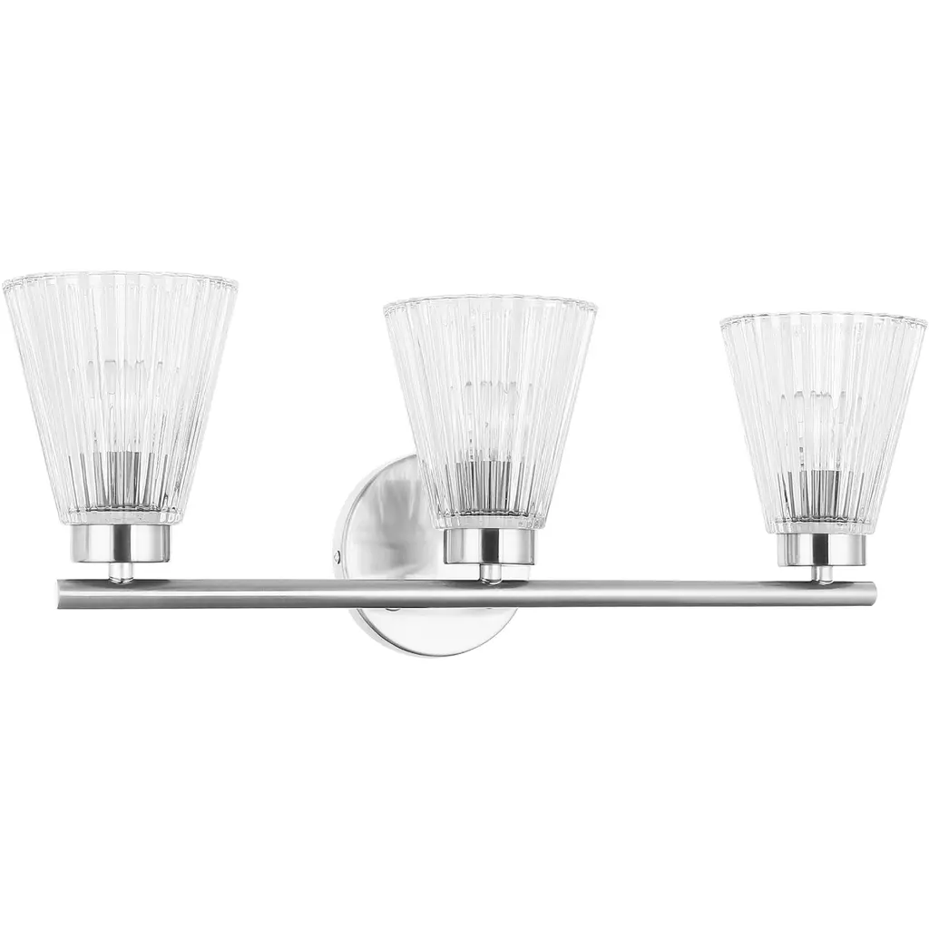 The cone-shaped glass on this 3-Light Vanity has a raised glass spiral texture on the exterior of the material, creating a unique texture and sparkle that is further emphasized by the Chrome finish. APPLICATIONS: Rated for damp locations, perfect for bathrooms and powder rooms. The brilliant chrome finish is on this super simple piece pops with the addition of the unusual striped conical clear glass shades. EASY TO INSTALL: Replacing an existing fixture is easy with the included instructions and can be finished in as little as 15 minutes with a few simple hand tools. Install with sockets opening either upward or downward. VERSATILE: Dimmable and LED/CFL/Incandescent compatible, uses three 100-Watt (max) E26 medium base bulbs (Not Included) RELIABLE: Includes 1-Year Full Manufacturer's Warranty. Warranty: 1 Year Room Recommendation: Bathroom/Powder Room Mounting Direction: Up or Down Shade Included: Yes