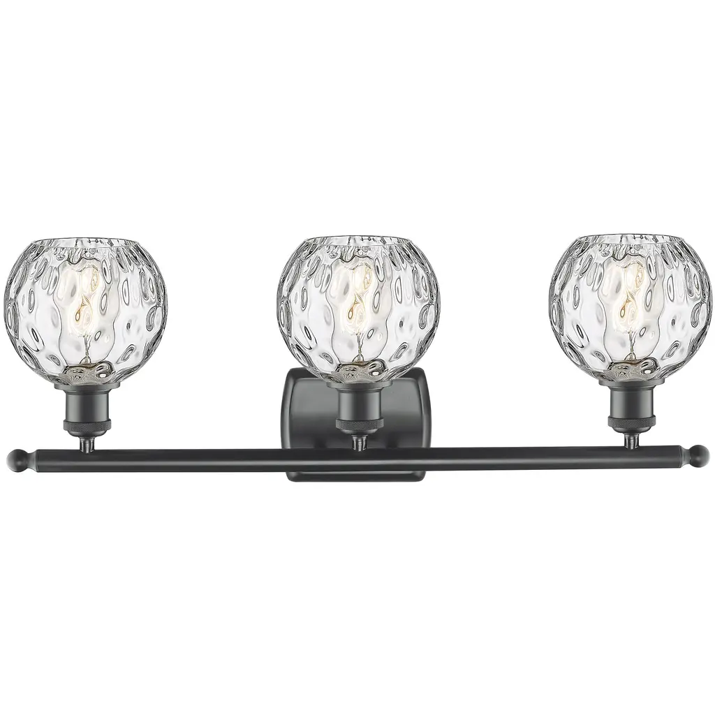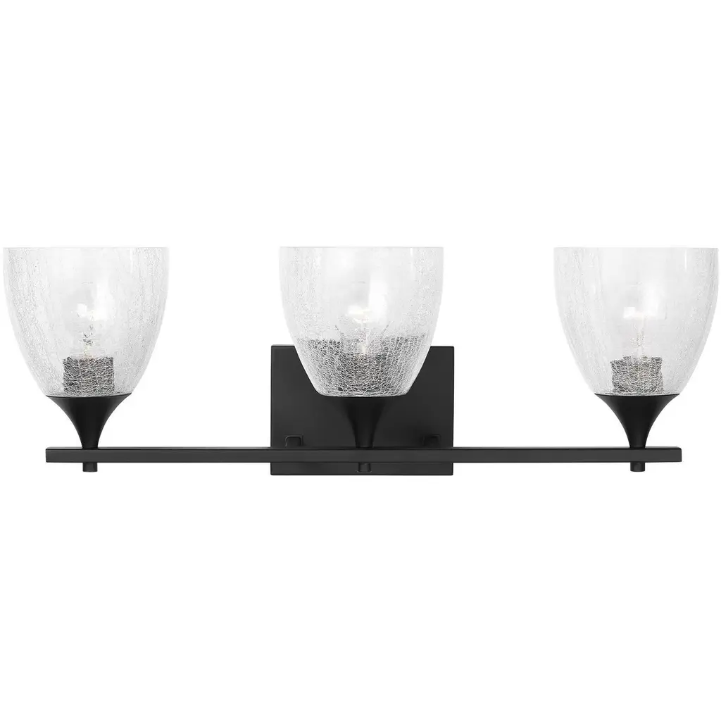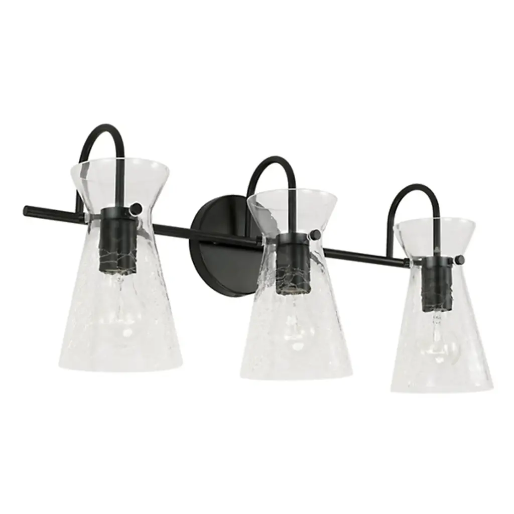 The sharp lines and artistic arches of the Peyton 3-Light Vanity are timelessly transitional. The muted tone of the Matte Black finish allows the seeded glass shade to take center stage. This fixture is available as a 2-light or 3-light. APPLICATIONS: Rated for damp locations, perfect for bathrooms and powder rooms. Cylindrical seeded glass shades offset the strong matte black arch elements in this classic fixture EASY TO INSTALL: Replacing an existing fixture is easy with the included instructions and can be finished in as little as 15 minutes with a few simple hand tools. Install with sockets opening either upward or downward. VERSATILE: Mounts bulbs up or down, dimmable and LED/CFL/Incandescent compatible, uses three 100-Watt (max) E26 medium base bulbs (Not Included) DIMENSIONS: 23 inchW x 9.75 inchH x 7 inchE; includes 1' of wire. RELIABLE: Includes 1-Year Limited Manufacturer's Warranty. Warranty: 1 Year Room Recommendation: Bathroom/Powder Room Mounting Direction: Up or Down