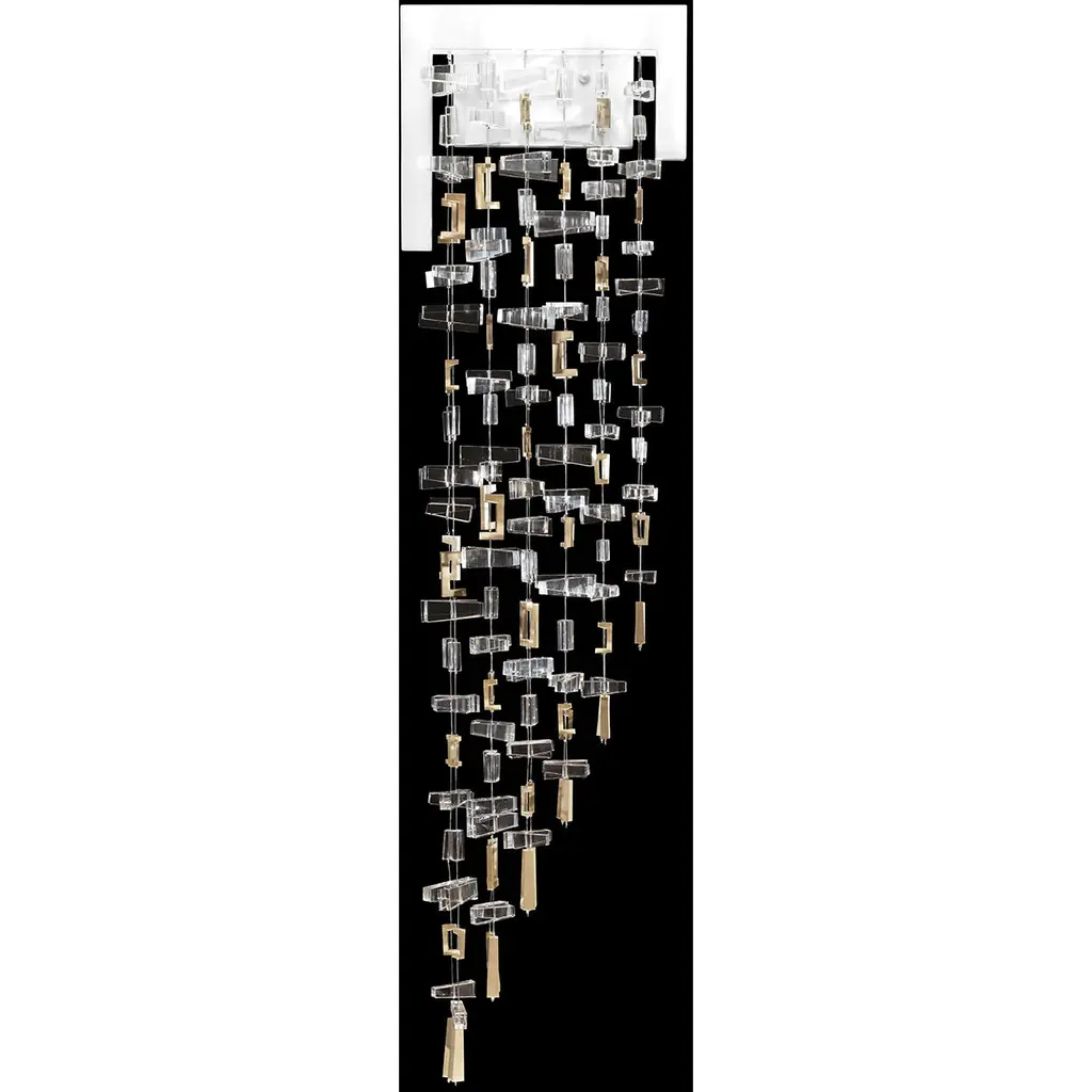 This Capri wall sconce re-imagines the timeless elegance of crystal strands with a modern architectural twist. A symphony of precision-cut crystals, interspersed with brass elements, are set horizontally and vertically to enhance their interplay with the