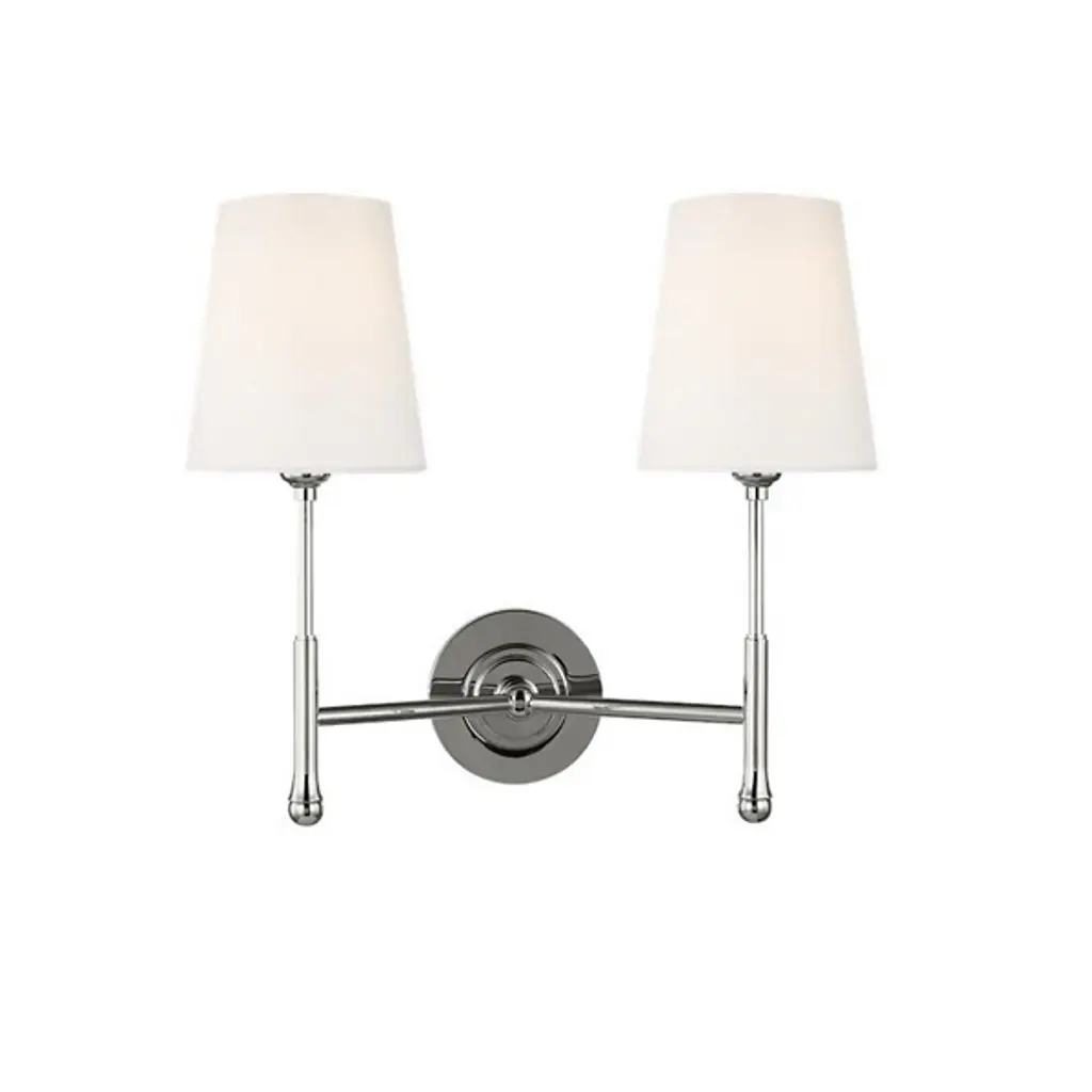 A basic wall light with subtle distinction. The Capri 2 Light Wall Sconce from Visual Comfort Studio, formerly known as TOB by Thomas OBrien, has a chic yet minimalist design that can be placed in a variety of different decors. It has a circle-shaped wall plate from which a pair of slender arms extend in different directions. Slim stems reside at the end of each arm and hold the light fittings and display some subdued detailing. Cone-shaped Fabric shades sit on top of each stem and diffuse the light for a glow that’s perfect for preparing for a work down or going out with friends.