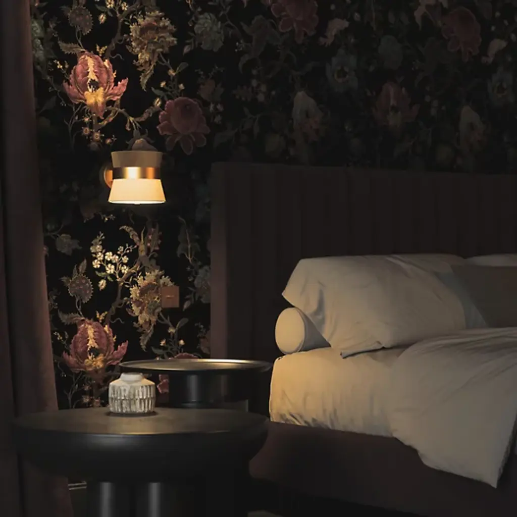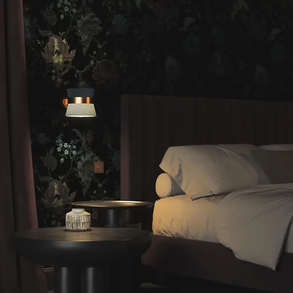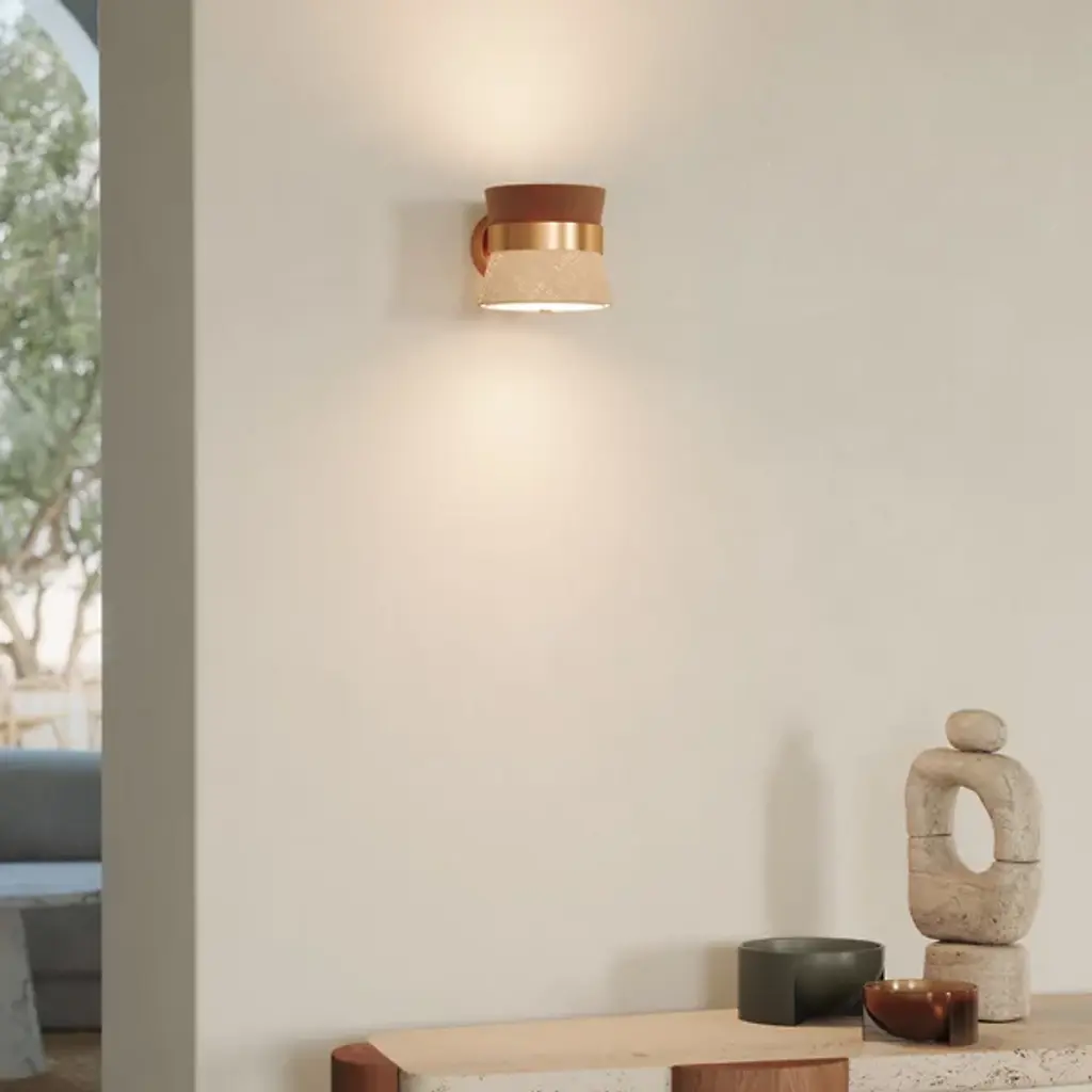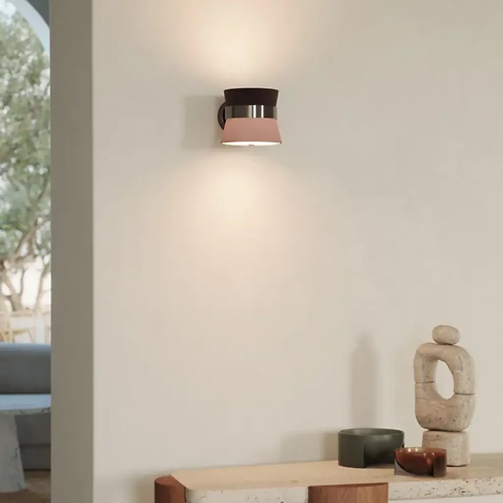Rich and sumptuous like soft caramel, the Caramelo Wall Sconce from Carpyen Easy Light delights with radiating golden hues. Creator Jette Scheib makes pieces that rethink functional objects while making one feel good. This piece shows sophistication with an elegantly finished backplate and cinching ring accent. A microfiber and fabric shade extends out of the ring with a high-style colorway. Their fine texture eases the light out as a cozy ambient glow.
