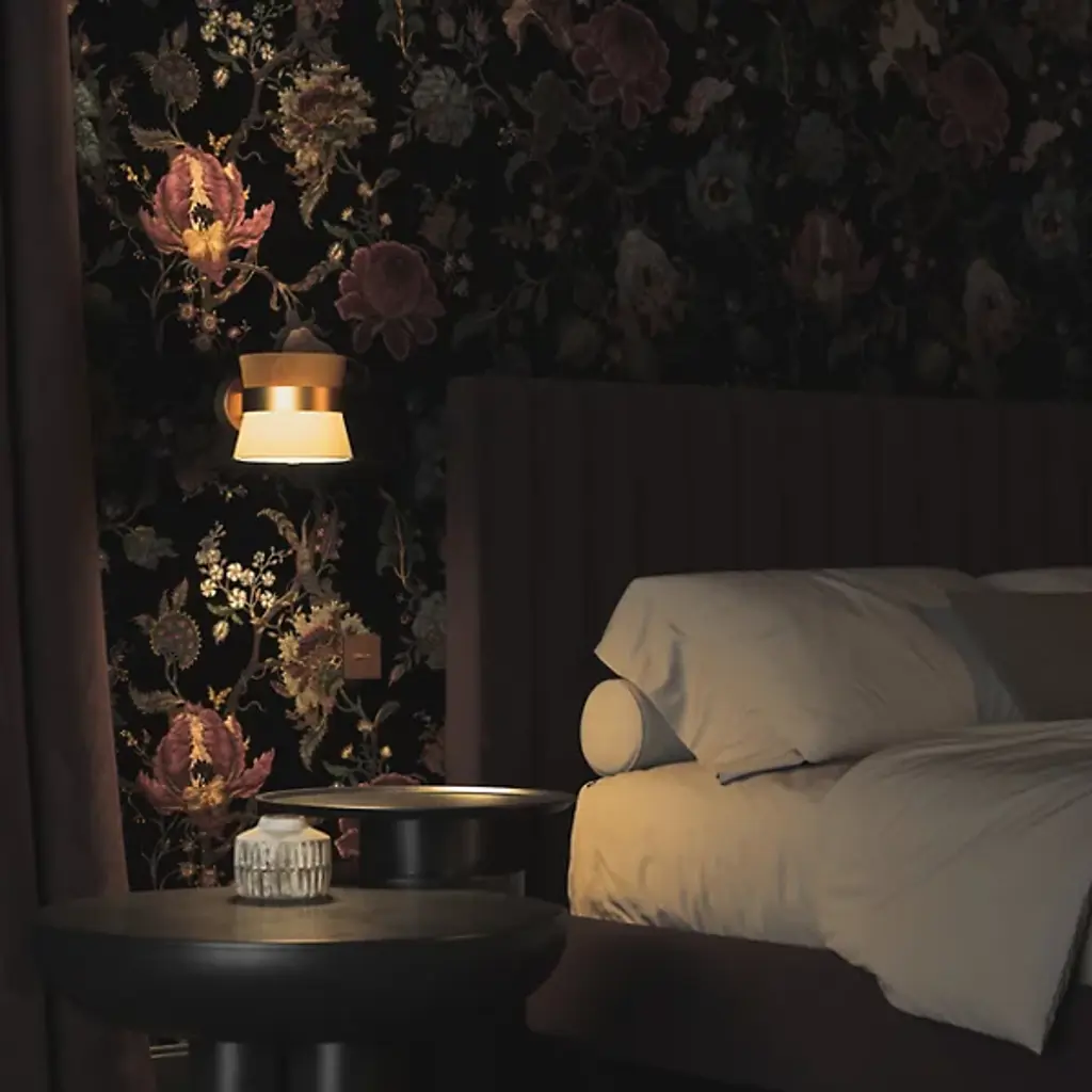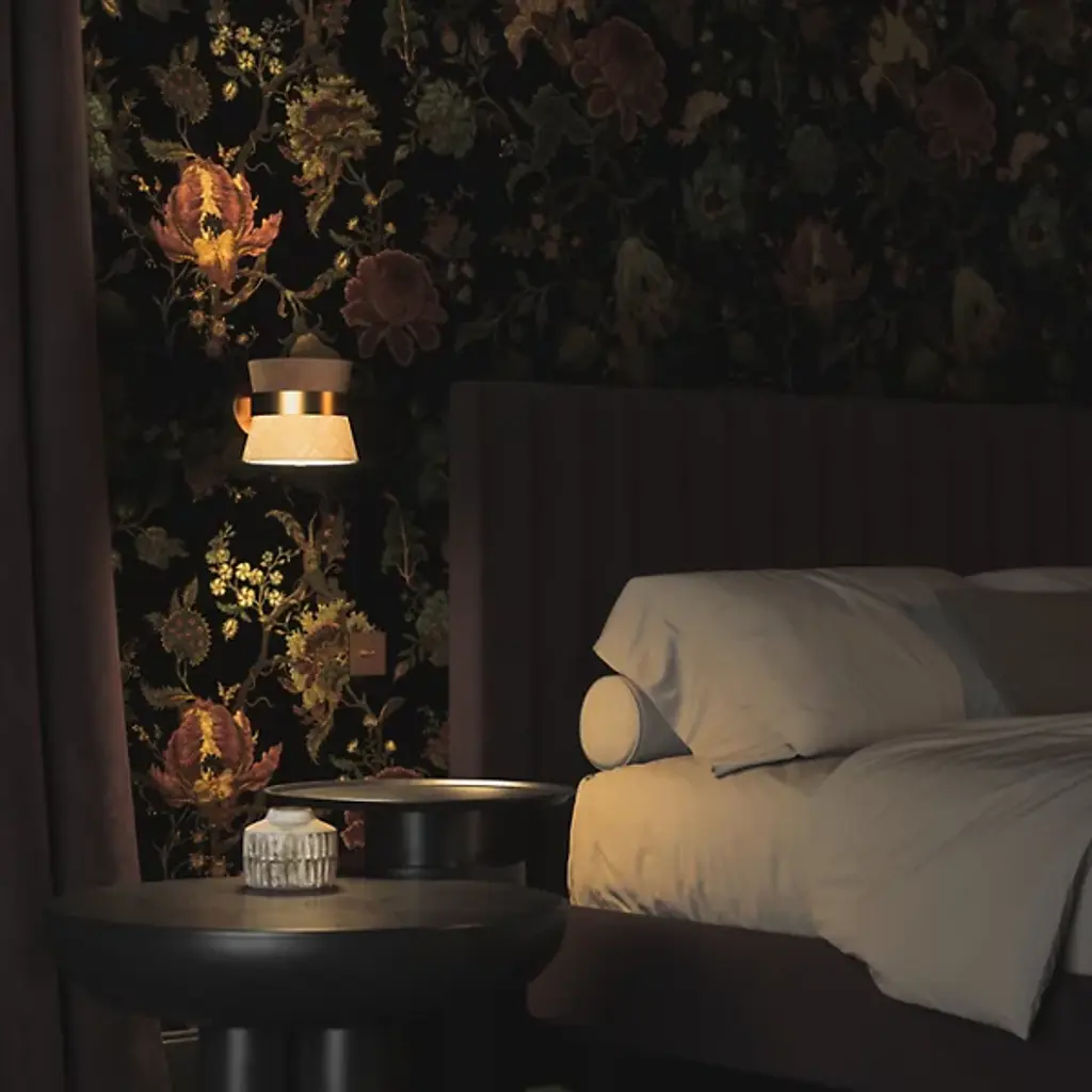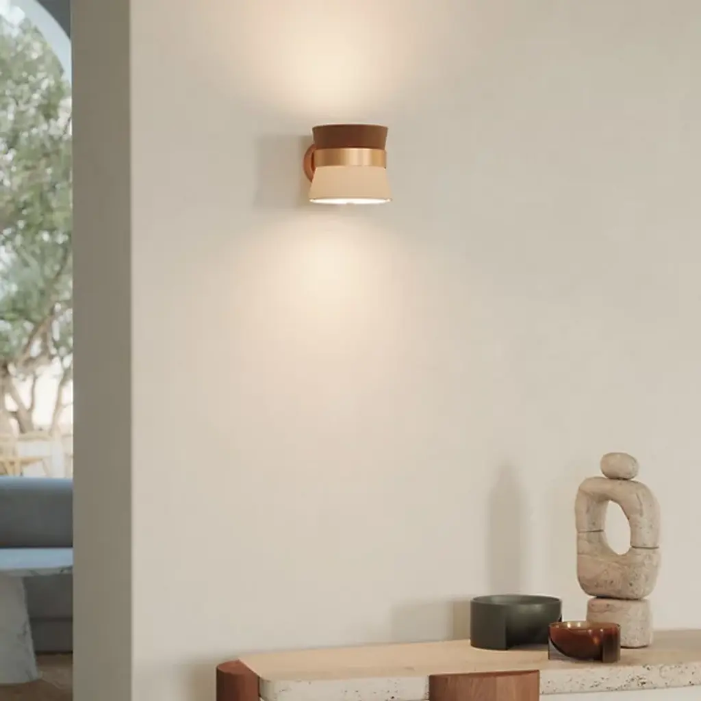 Rich and sumptuous like soft caramel, the Caramelo Wall Sconce from Carpyen Easy Light delights with radiating golden hues. Creator Jette Scheib makes pieces that rethink functional objects while making one feel good. This piece shows sophistication with an elegantly finished backplate and cinching ring accent. A microfiber and fabric shade extends out of the ring with a high-style colorway. Their fine texture eases the light out as a cozy ambient glow.