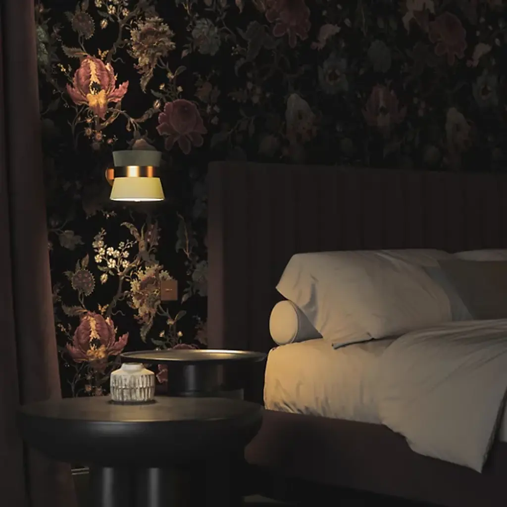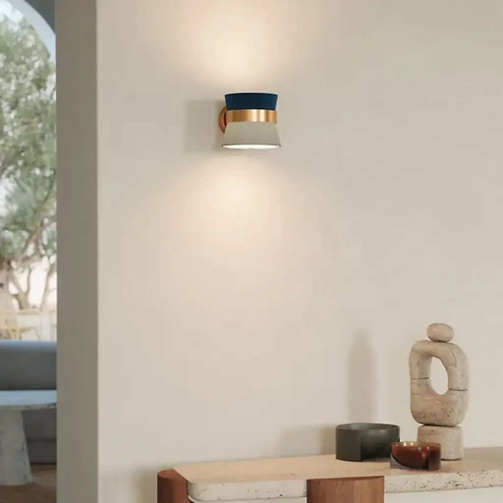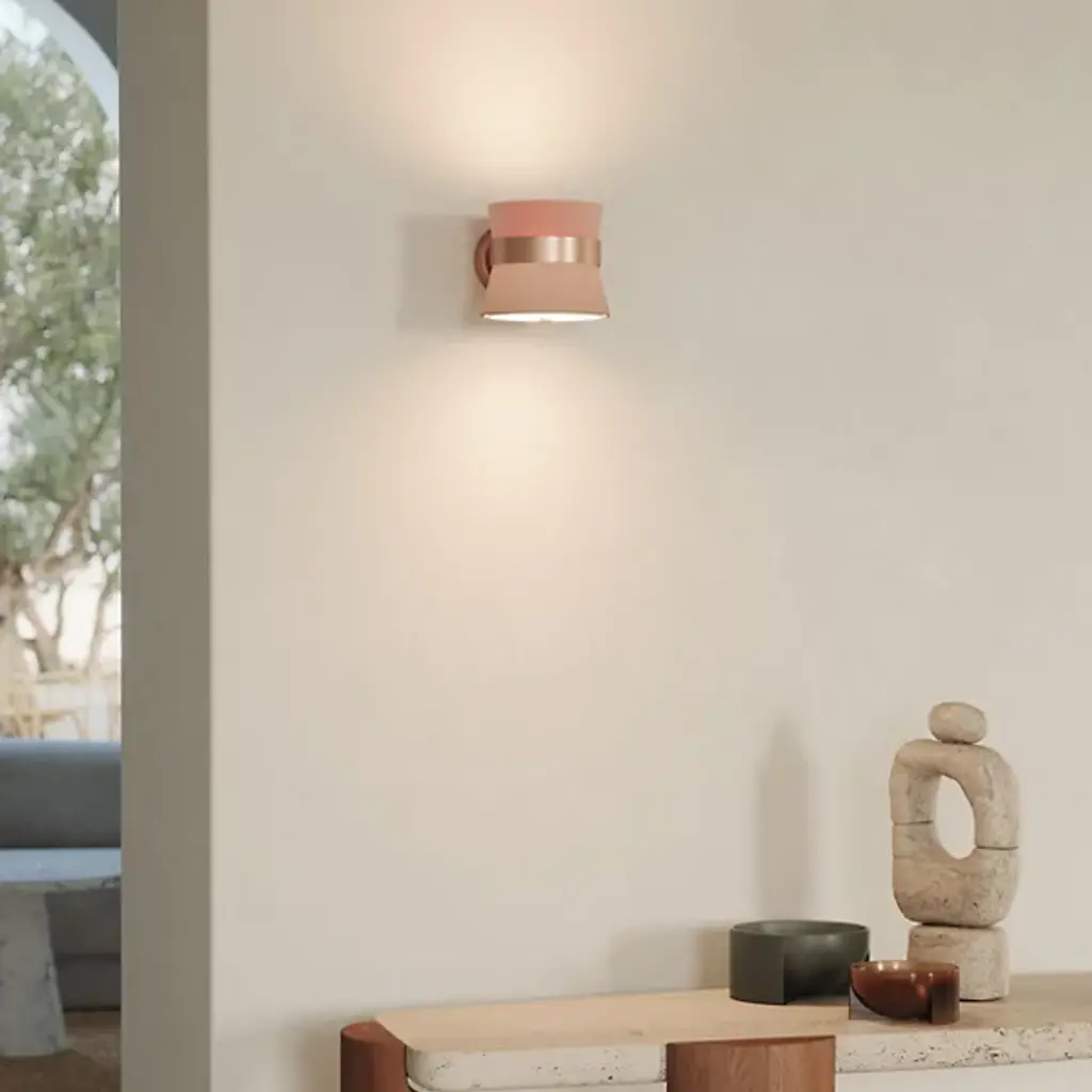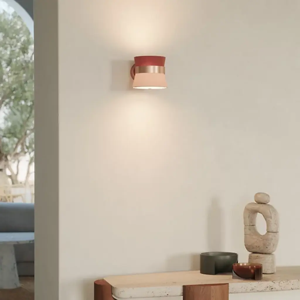 Rich and sumptuous like soft caramel, the Caramelo Wall Sconce from Carpyen Easy Light delights with radiating golden hues. Creator Jette Scheib makes pieces that rethink functional objects while making one feel good. This piece shows sophistication with an elegantly finished backplate and cinching ring accent. A microfiber and fabric shade extends out of the ring with a high-style colorway. Their fine texture eases the light out as a cozy ambient glow.