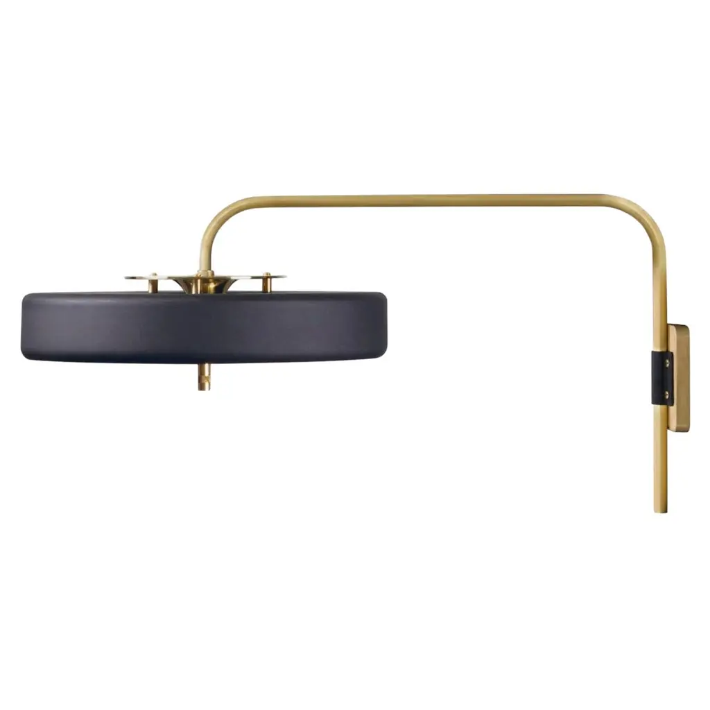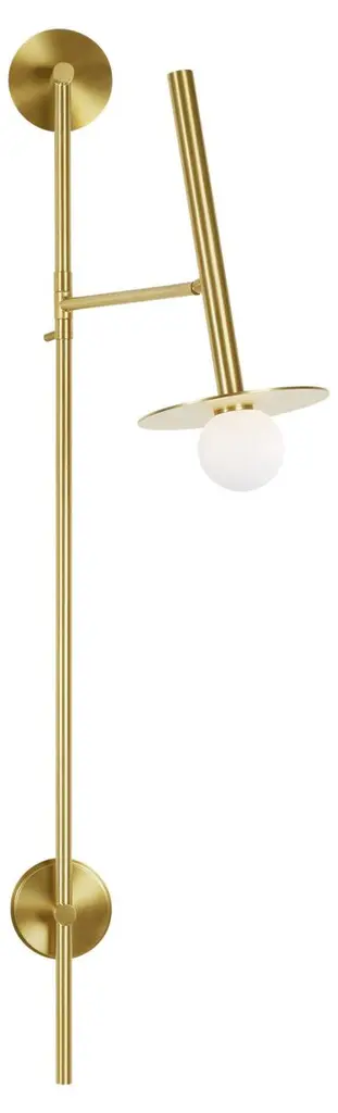 An artistic and flexible design concept, crystal orbs are illuminated behind curved naturally aged brass shades. The oversized panes are mounted to LED light housings that can rotate to provide either ambient indirect lighting that is directed upwards at the crystal for a glowing effect, or these LEDs can be rotated to shine downward for ample lighting. The two-arm wall sconce has a longer extension in the arm with individual light switches on the backplate to be used for directed task lighting great for bedside applications or creating a space within a room that will serve as task lighting.