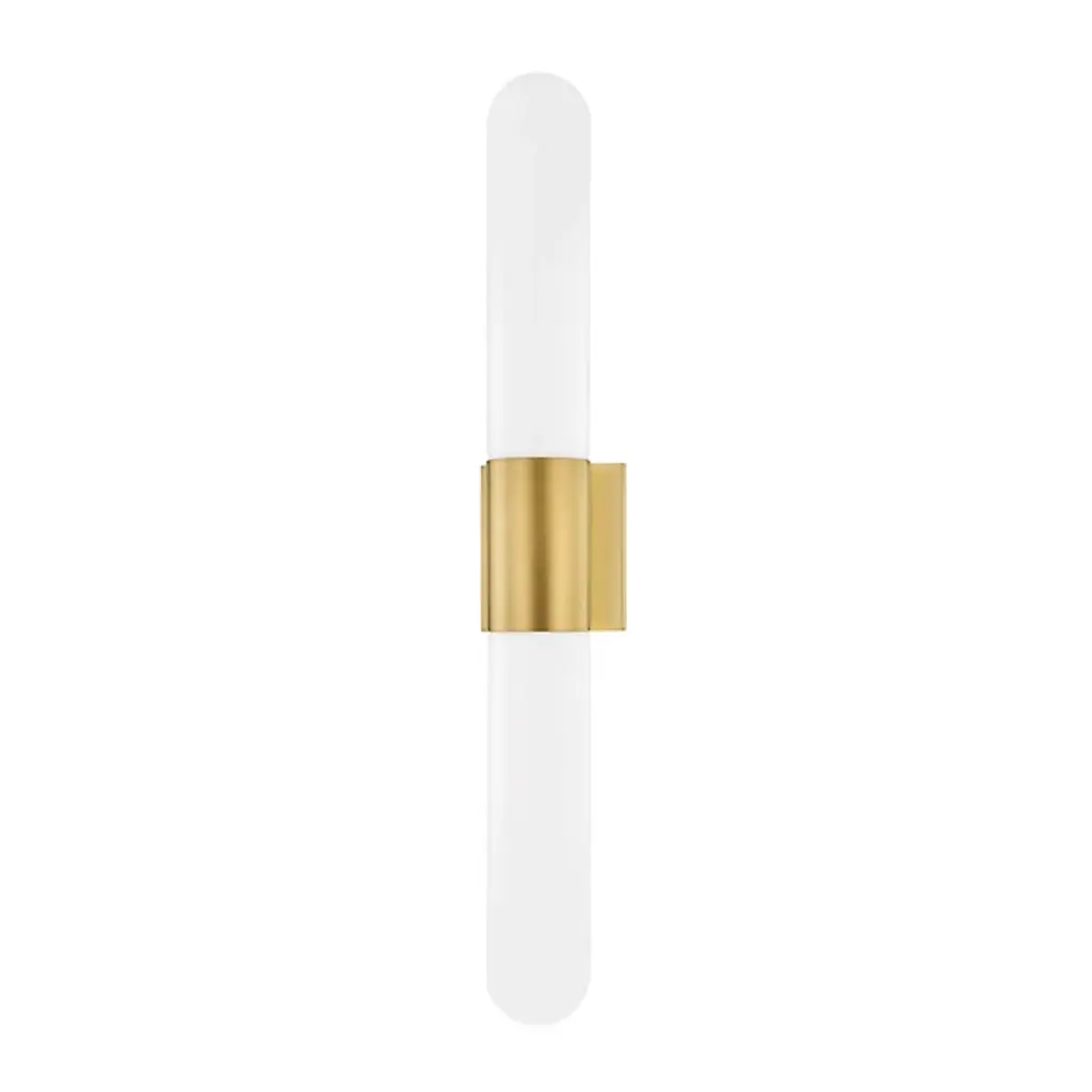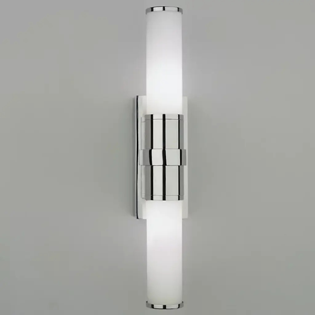 Create a stylish and space-age character around your walls and hallways with the Carlin Wall Sconce from Hudson Valley Lighting. A striking fixture with modern design elements, it uses a sharp-cornered wall plate and cylindrical collar to seat a light in each end, gentled by tube-style diffusers made from white glass that create an elongated capsule shape when viewed together. Easily mounted vertically or horizontally, the translucent glass surfaces mellow direct glare from the lamping, creating an even ambiance around the fixture.