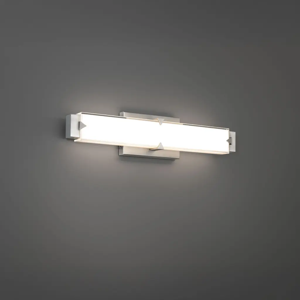 Modern Geometry. Rectilinear shapes intersect with triangles in the Carlisle wall sconce, creating a bold graphic frame that holds a color temperature selectable LED light bar. The sleek silhouette casts a warm glow into the surrounding space. Carlisle is offered in 11, 20, 27 and 37-inch sizes and is available in a choice of aged brass or brushed nickel finishes.