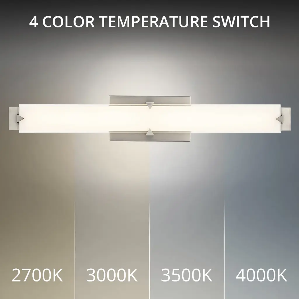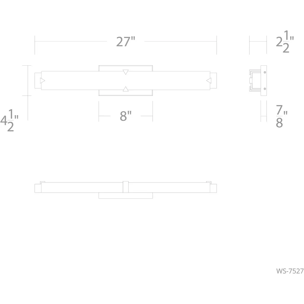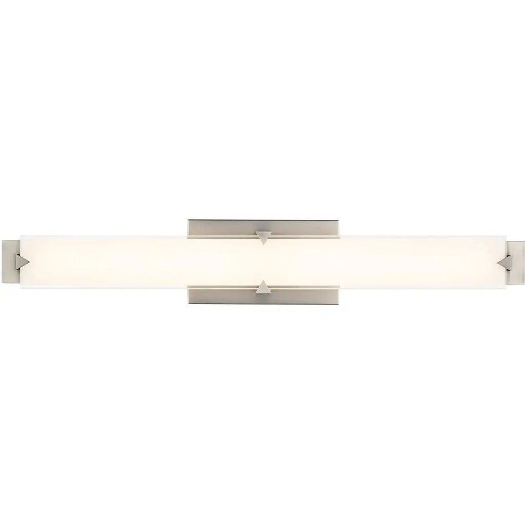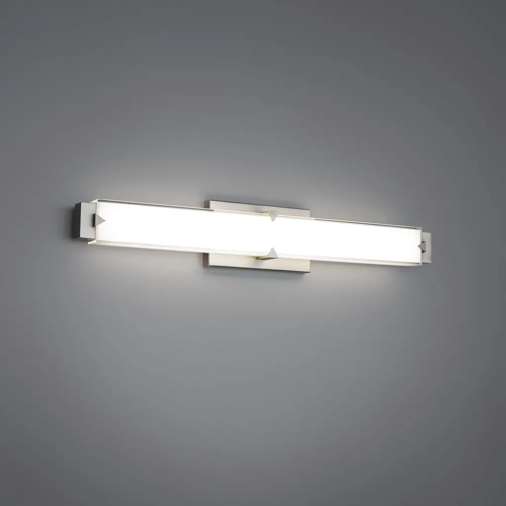 Modern Geometry. Rectilinear shapes intersect with triangles in the Carlisle wall sconce, creating a bold graphic frame that holds a color temperature selectable LED light bar. The sleek silhouette casts a warm glow into the surrounding space. Carlisle is offered in 11, 20, 27 and 37-inch sizes and is available in a choice of aged brass or brushed nickel finishes.