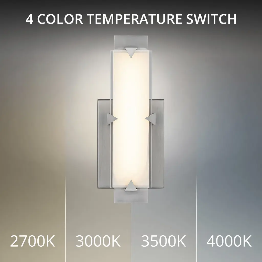 Modern Geometry. Rectilinear shapes intersect with triangles in the Carlisle wall sconce, creating a bold graphic frame that holds a color temperature selectable LED light bar. The sleek silhouette casts a warm glow into the surrounding space. Carlisle is offered in 11, 20, 27 and 37-inch sizes and is available in a choice of aged brass or brushed nickel finishes.