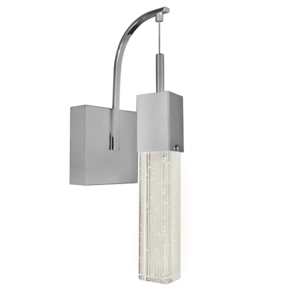Add life and light to your home with the Carlita LED Wall Sconce from Huxe. Hanging from a gracefully curved arm is a rectangular pendant made of smooth metal and clear glass. A brief, cylindrical downrod allows it to dangle in the space, while the metal and glass contrast elevates the appeal, allowing it to adorn a range of styles. An integrated LED within the piece brings the glass to life, exciting the bubble texture on the surface and creating an inviting, warm display.