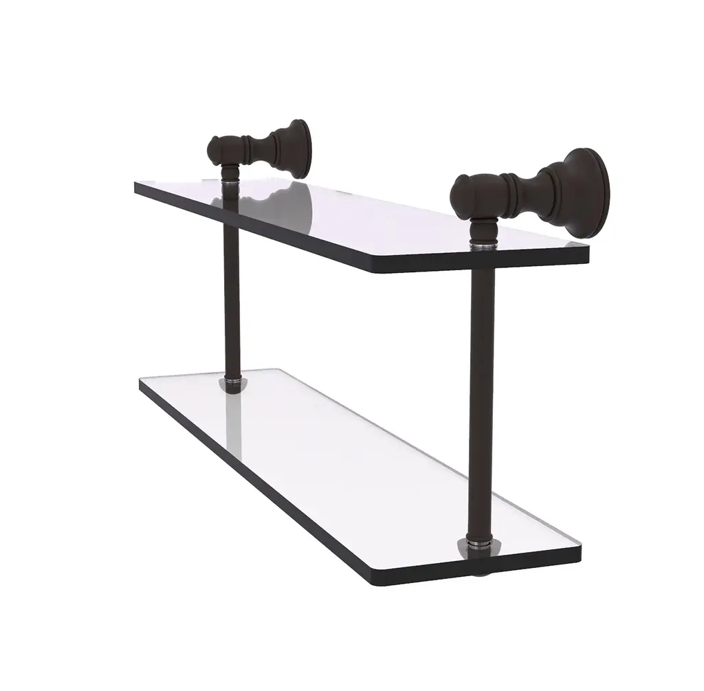 Reimagine your bathroom with this finely crafted double glass shelf. The 2 sturdy glass shelves provide plenty of space for your items. Traditional style and superior quality resonate from this hand crafted accessory. Featuring thick, beveled-edge glass and solid brass hardware this shelf is crafted for durability strength and style. One of the many coordinating accessories in the Allied Brass Collection of accessories, this double glass shelf is the perfect complement to your bathroom decor.Oil Rubbed Bronze, a finish that reflects a dark brown, architectural finish with striking accentsCrafted from the finest solid brass materialsConcealed screw mounting hardware installs easilySpace saving design makes efficient use of your spaceTraditional design with classic design elementsGlass Dimension 16 Inches x 5 InchesProvided with a Limited lifetime warranty