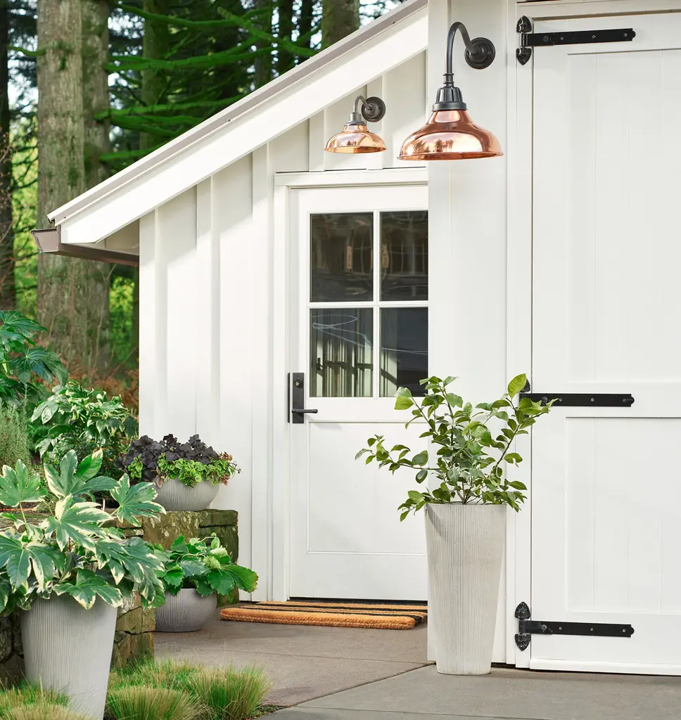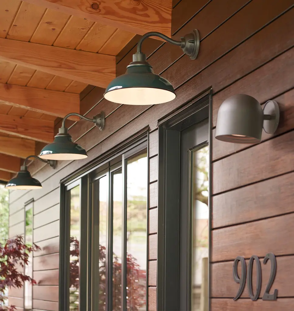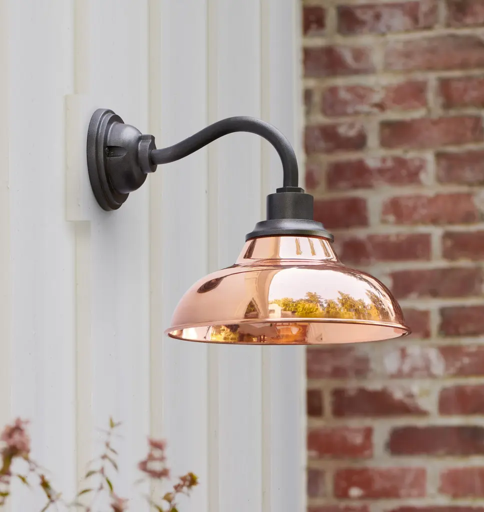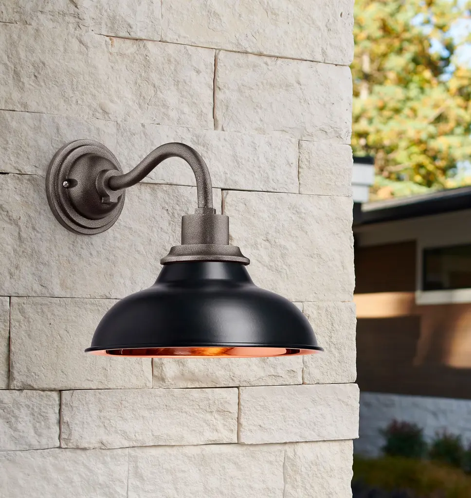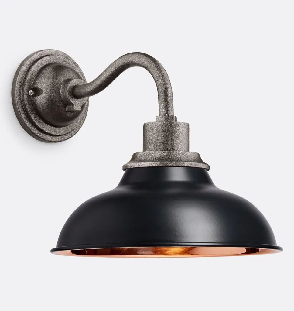 Inspired by industrial warehouse lighting from the early 1900s, our Carson 12-inch Wall Sconce features a classic, gooseneck silhouette and adds inviting light to front porches and outdoor patios. Add a personalized touch to yours with our wide range of color options. Details You'll Appreciate Inspired by industrial warehouse lighting from the early 20th century Classic gooseneck sconce design Lightweight aluminum fixture Available with an optional, removable cage for a utilitarian look Product Specifications Lightweight aluminum fixture with your choice of spun aluminum or spun copper shade Spun aluminum shade with enamel color and black rim accent Hardwired; professional installation recommended Suitable for indoor and outdoor use (UL Rated Wet) Imported