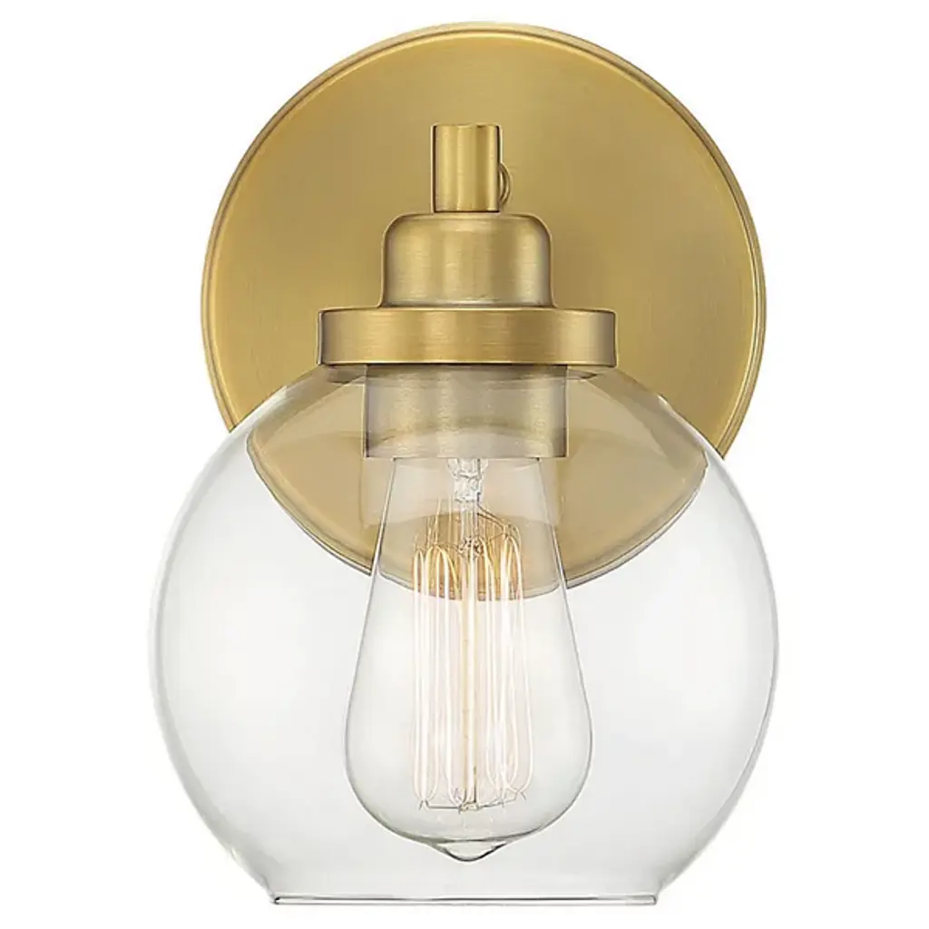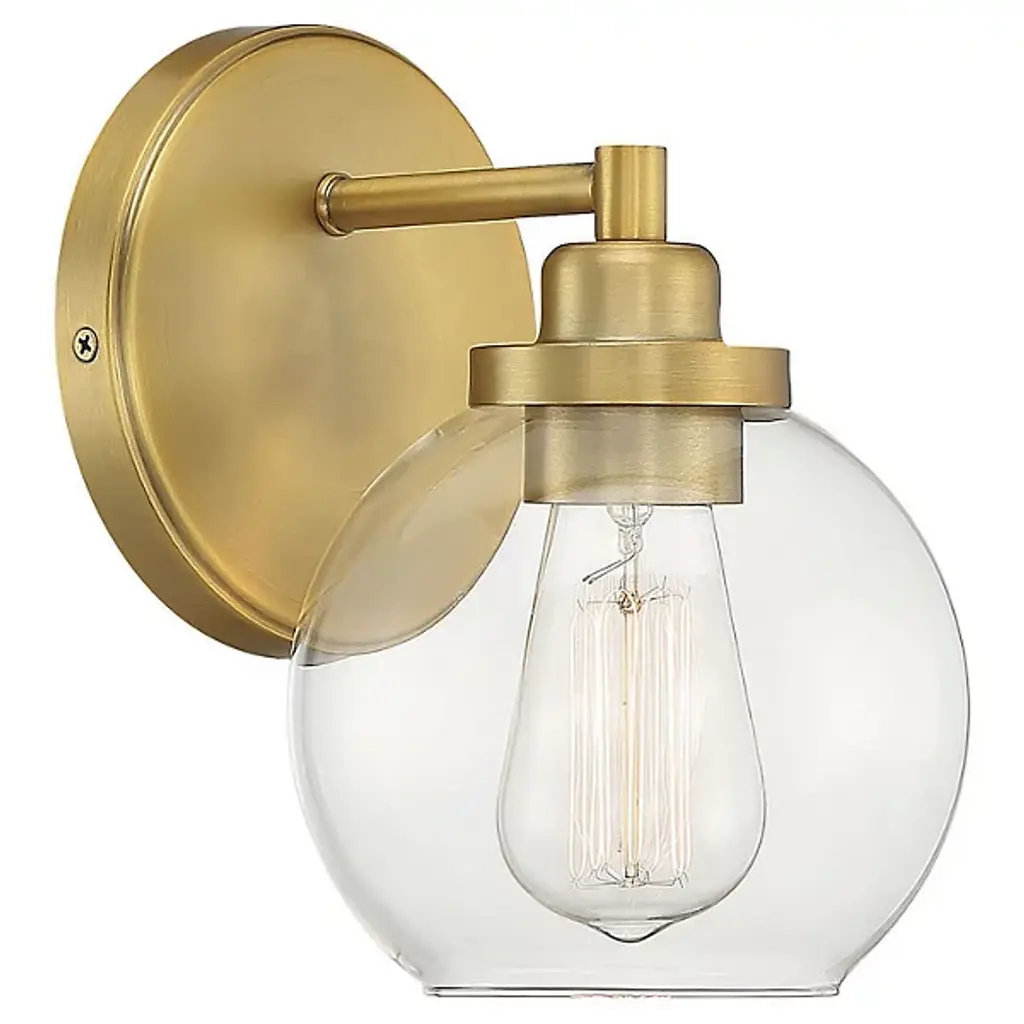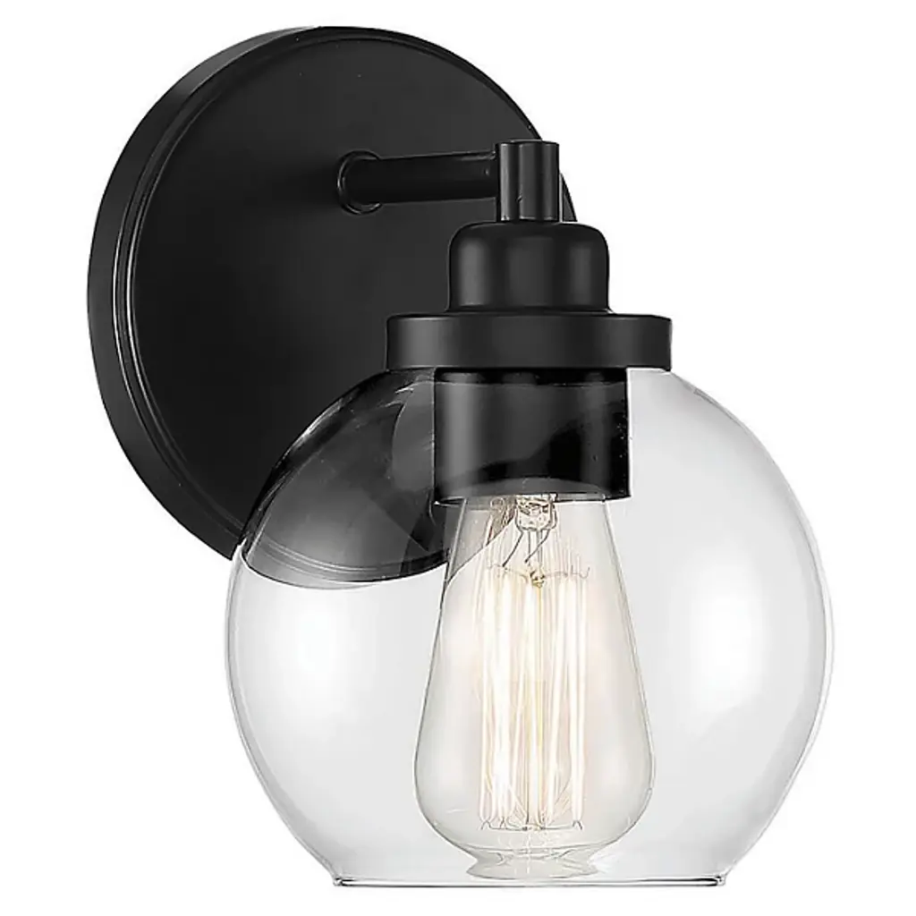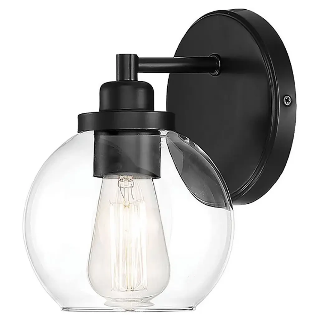 The Carson Bath Sconce by Savoy House brings a clean, minimalistic design to the home. With a subtle vintage look, this bath sconce has a glass globe shade with an open bottom for easy bulb replacement and a mid-century modern touch. Its streamlined frame is anchored to the wall by a circular backplate that reflects the smooth curves of its shade and brings a fresh and modern quality to the room as it brightens.