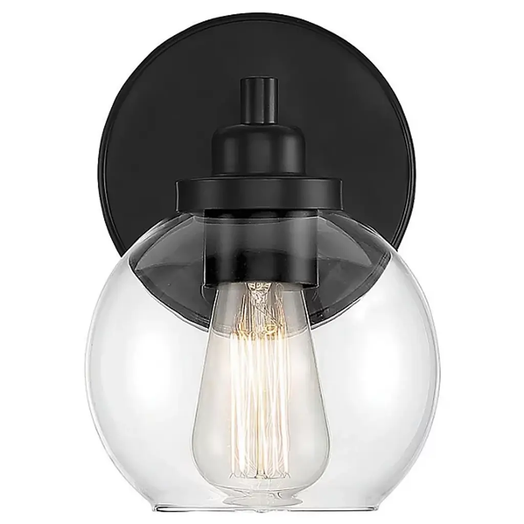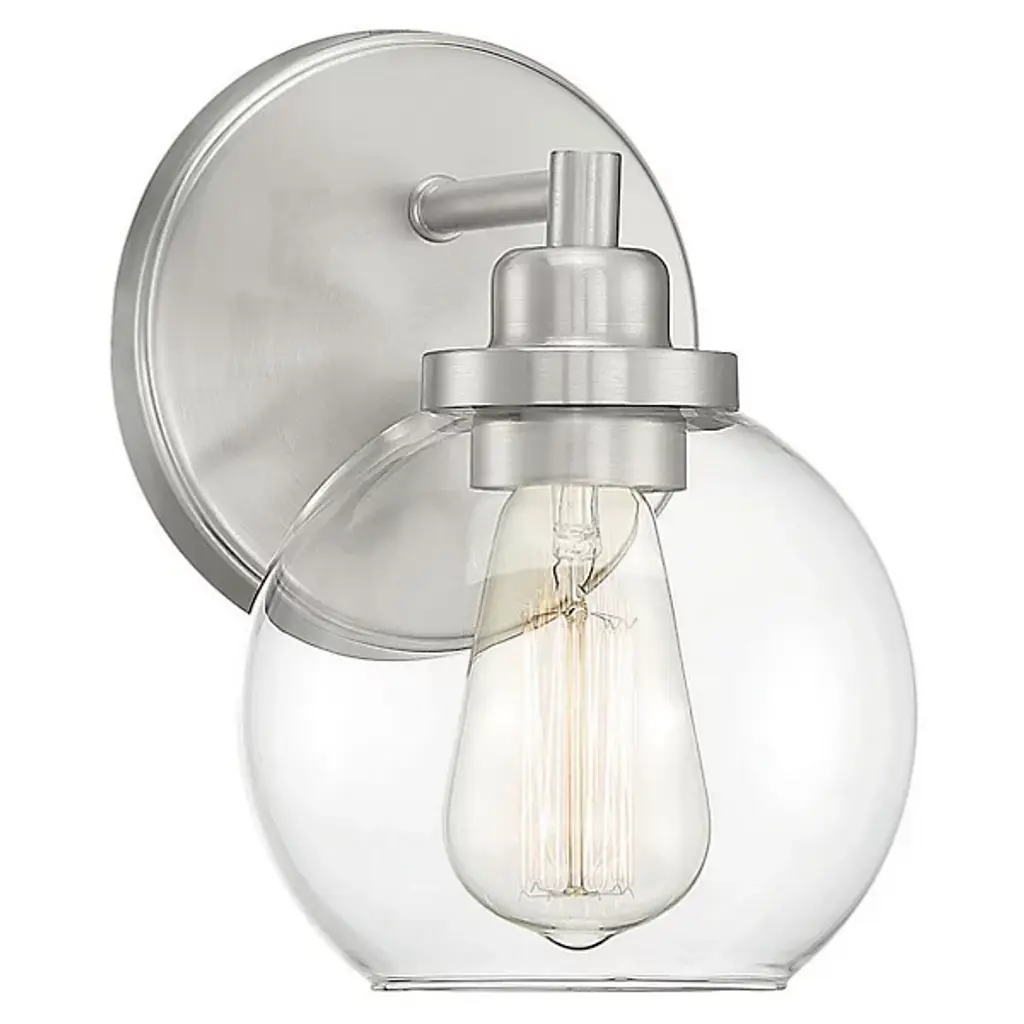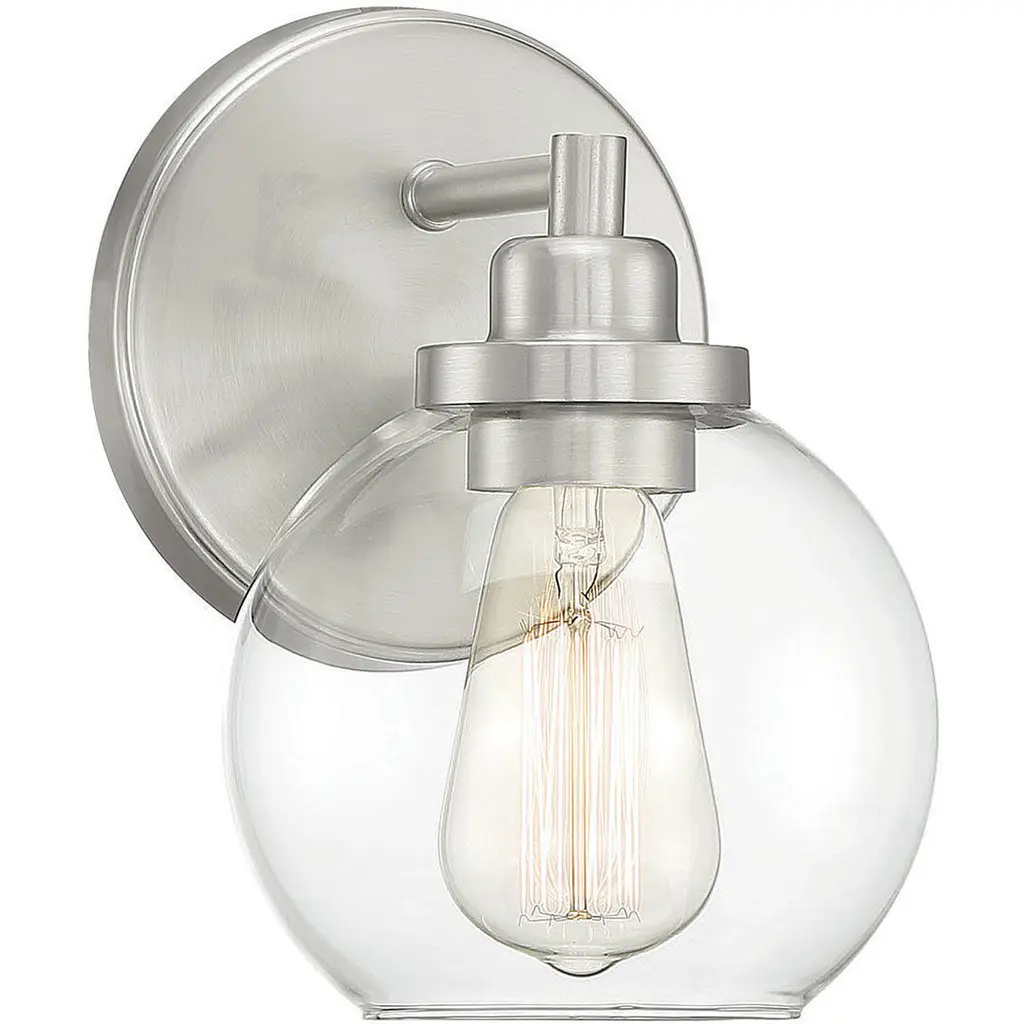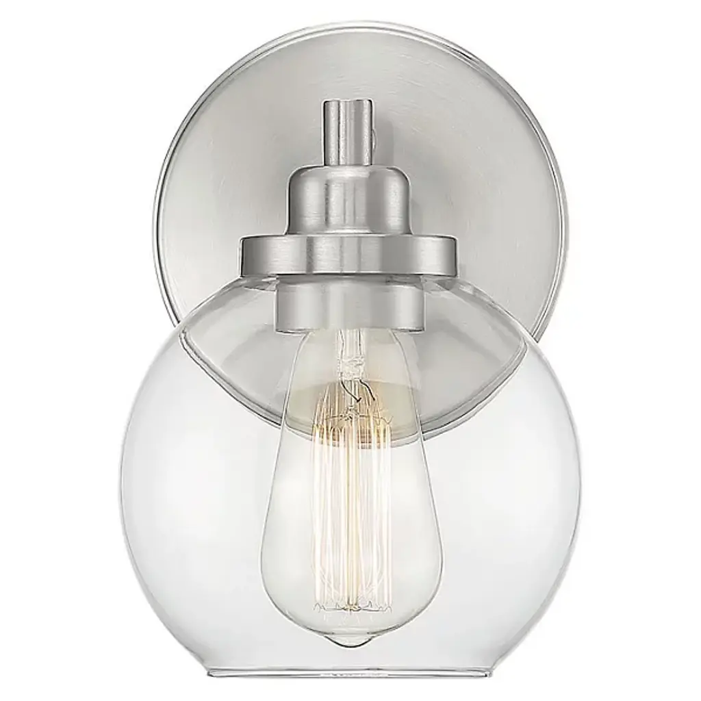 The Carson Bath Sconce by Savoy House brings a clean, minimalistic design to the home. With a subtle vintage look, this bath sconce has a glass globe shade with an open bottom for easy bulb replacement and a mid-century modern touch. Its streamlined frame is anchored to the wall by a circular backplate that reflects the smooth curves of its shade and brings a fresh and modern quality to the room as it brightens.