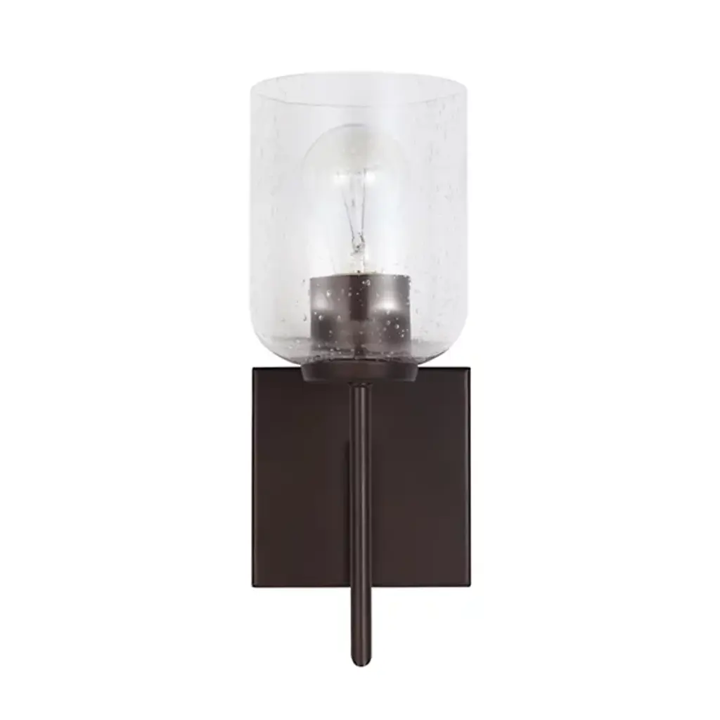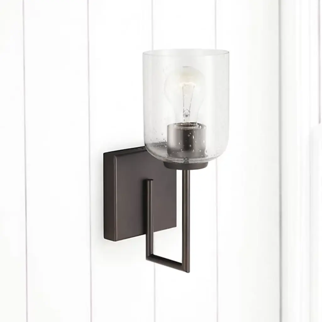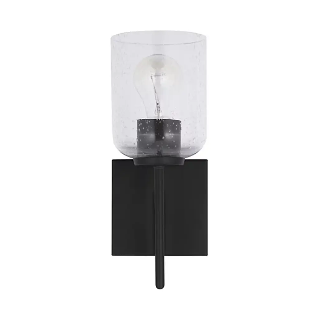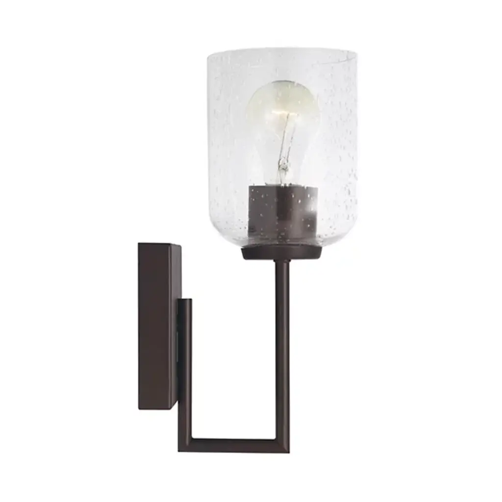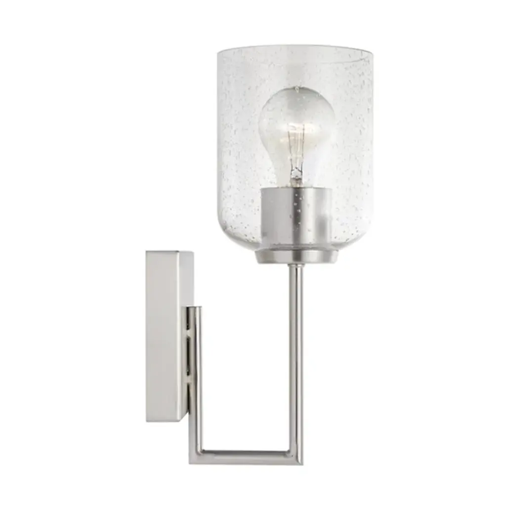 The Carter Wall Sconce by Capital Lighting has a clean, contemporary look that pulls from modern design patterns. Supporting a smooth, cylindrical glass shade, a sleek socket and structured metal arm with crisp bends connect to a square backplate for a clean composition. Plenty of light escapes from this wall sconce, adding a bright touch to surroundings, and the fresh, open silhouette of this design makes a handsome addition to spaces.