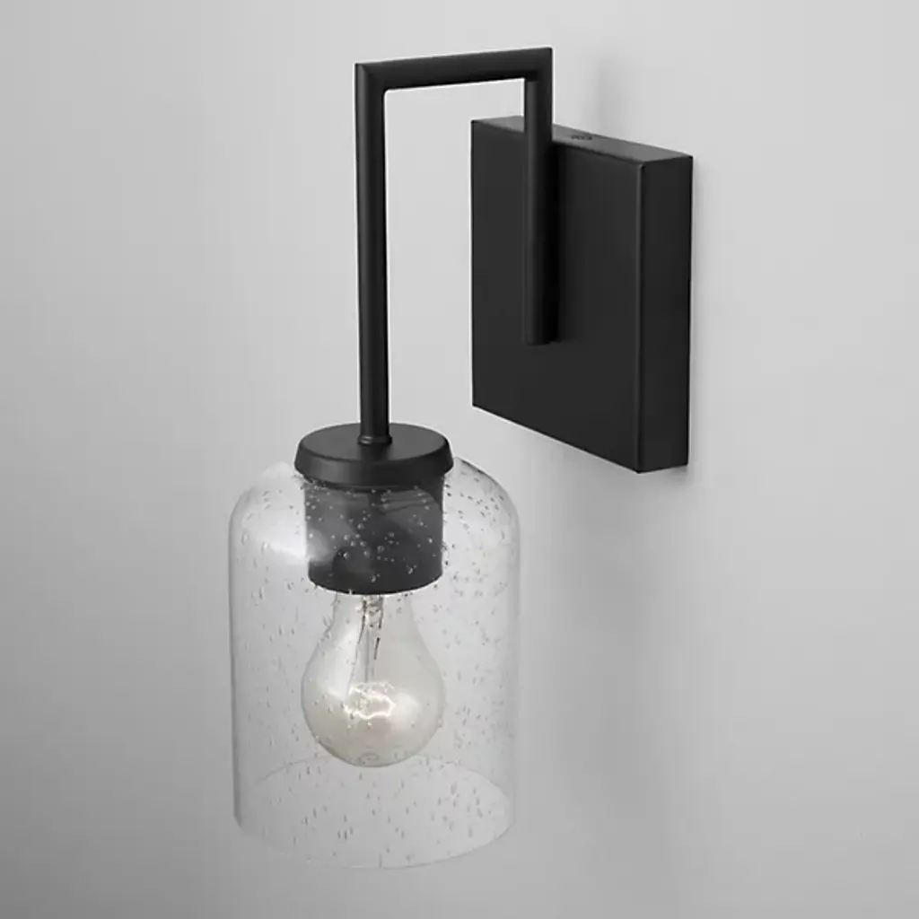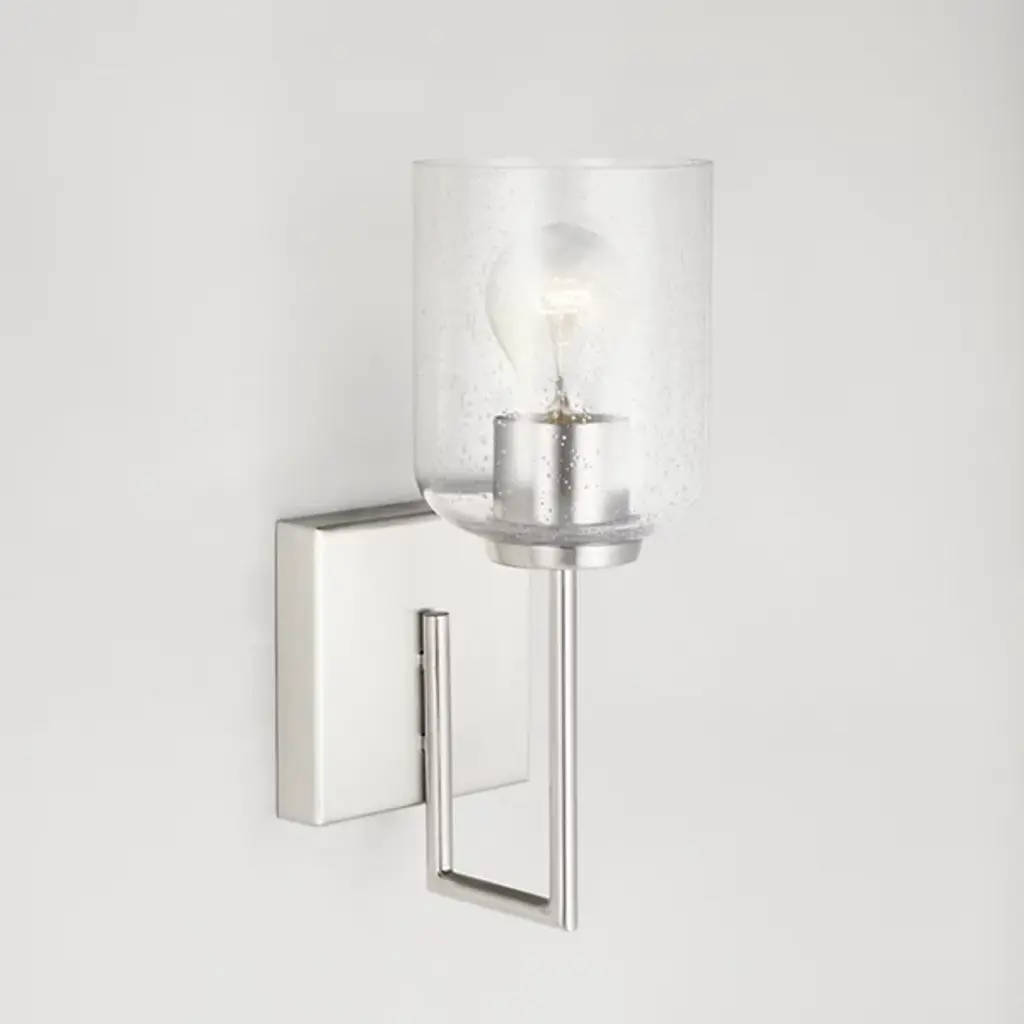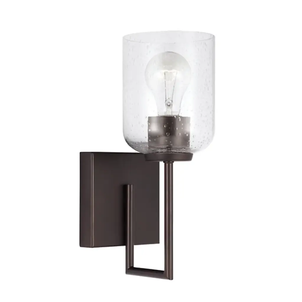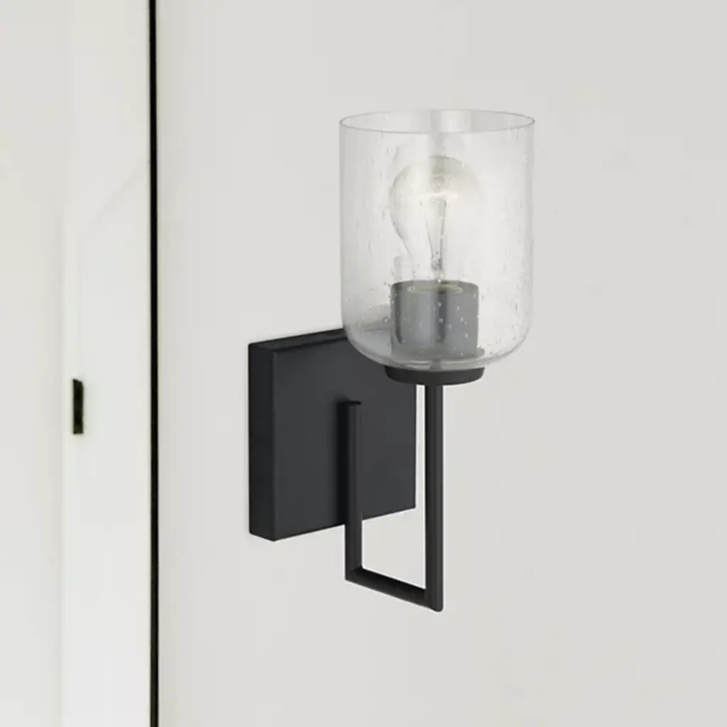 The Carter Wall Sconce by Capital Lighting has a clean, contemporary look that pulls from modern design patterns. Supporting a smooth, cylindrical glass shade, a sleek socket and structured metal arm with crisp bends connect to a square backplate for a clean composition. Plenty of light escapes from this wall sconce, adding a bright touch to surroundings, and the fresh, open silhouette of this design makes a handsome addition to spaces.