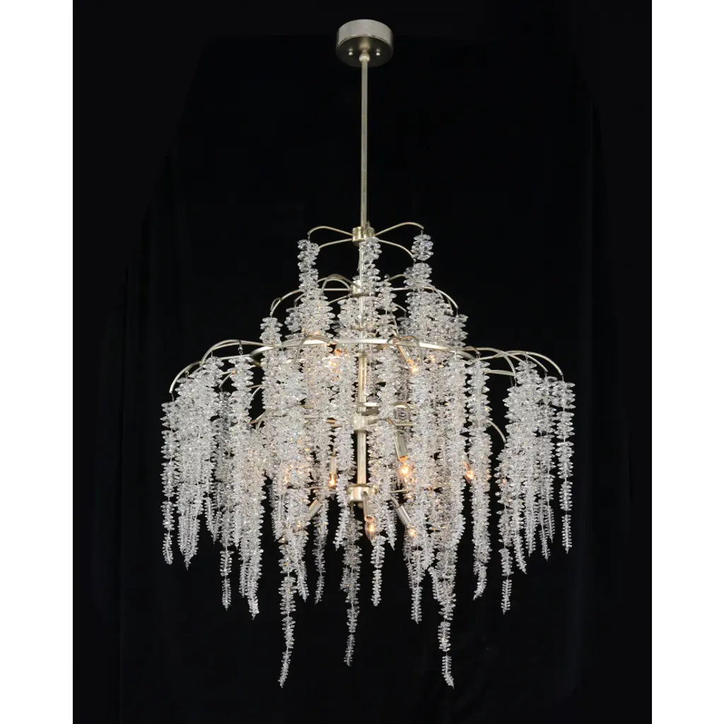 A two-light cascading crystal waterfall wall sconce in antique silver leaf. Candelabra Base, 60 Watt Max, 2 Type B Bulbs, TTM: 8", Backplate: 6" X 6" X 1", Direct Wire Only