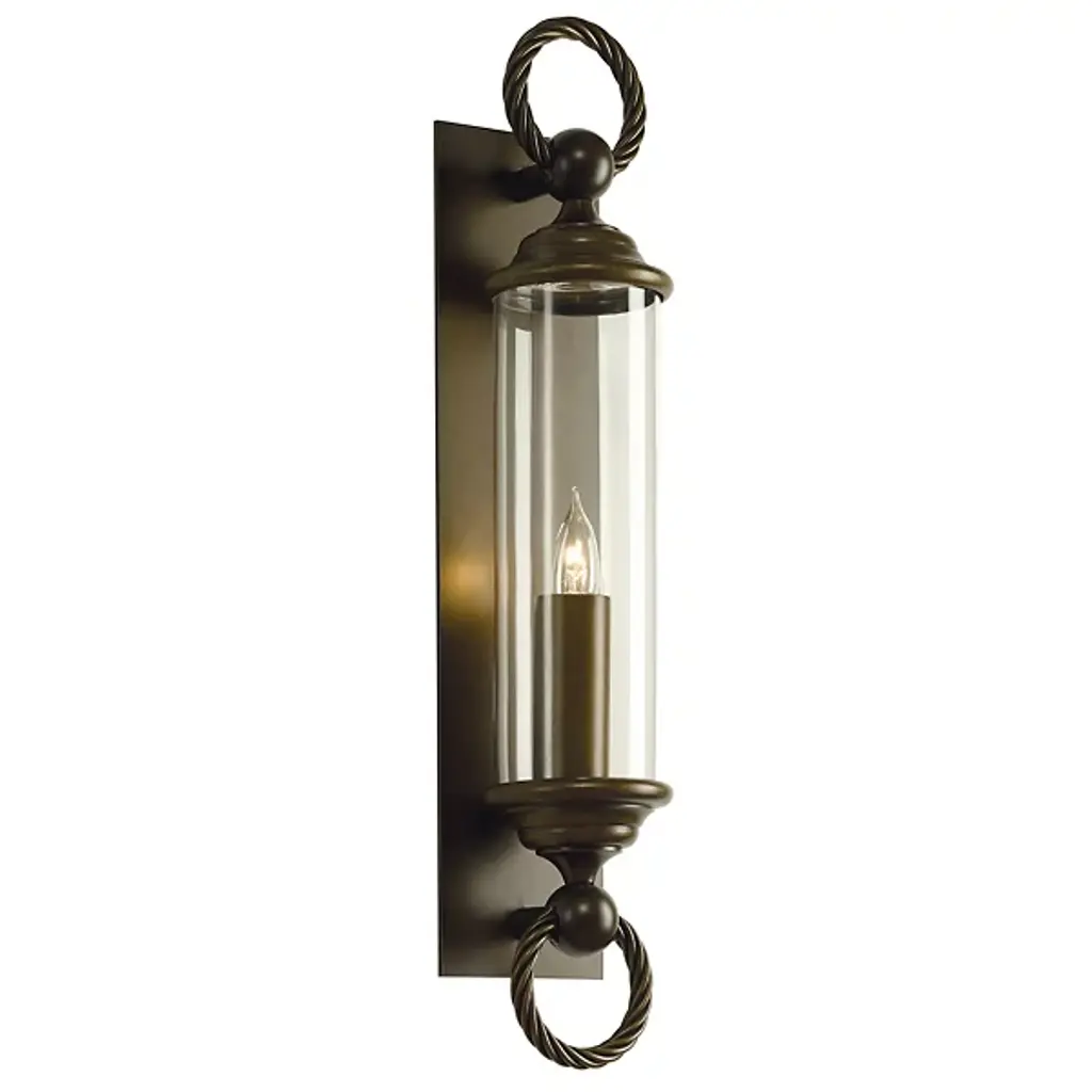 The Hubbardton Forge Cavo Large Outdoor Wall Sconce features a glass cylinder framed in twisted cables of metal that is suggestive of an ancient scroll. The simple and clean design showcases beautiful hand blown glass completed with ball end caps that merge with the rope-like metal on both top and bottom. Coastal finishes are meant to endure harsh saltwater environments and have been tested to 100% humidity and water with salinity 50% greater than the average found in the Atlantic or Pacific.