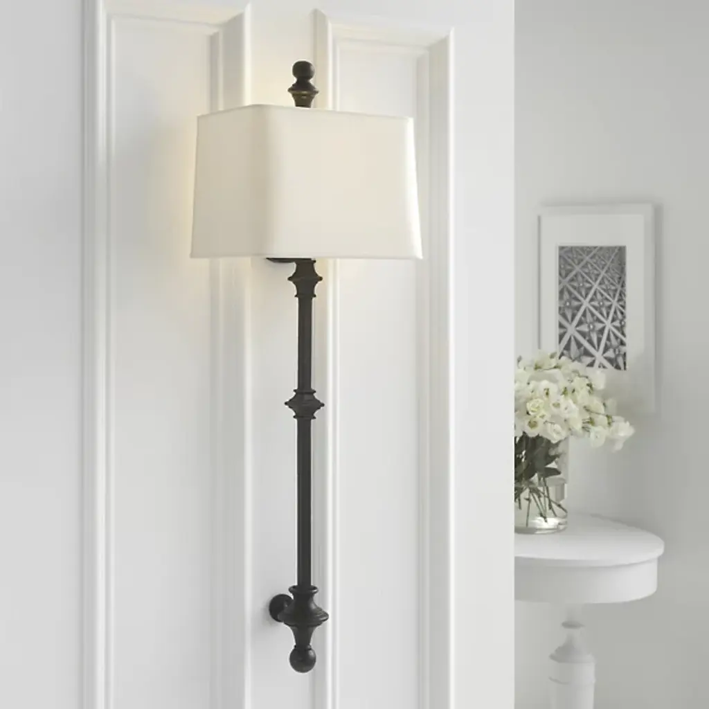 The Cawdor Stanchion Wall Light by Visual Comfort Signature, formerly known as Visual Comfort, is a handsome addition to a variety of interior settings, featuring a traditionally sculpted stem, smooth, tapered accents and opposing balled finials. A rectangular Natural Paper shade complements the stem beautifully, offering a warm ambient light that adds depth and shading to its various curves and indentations.