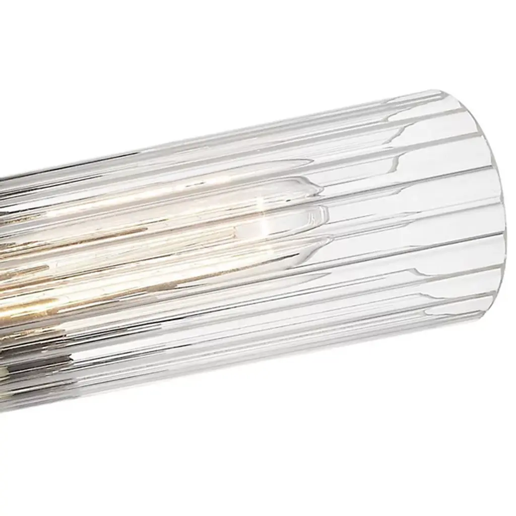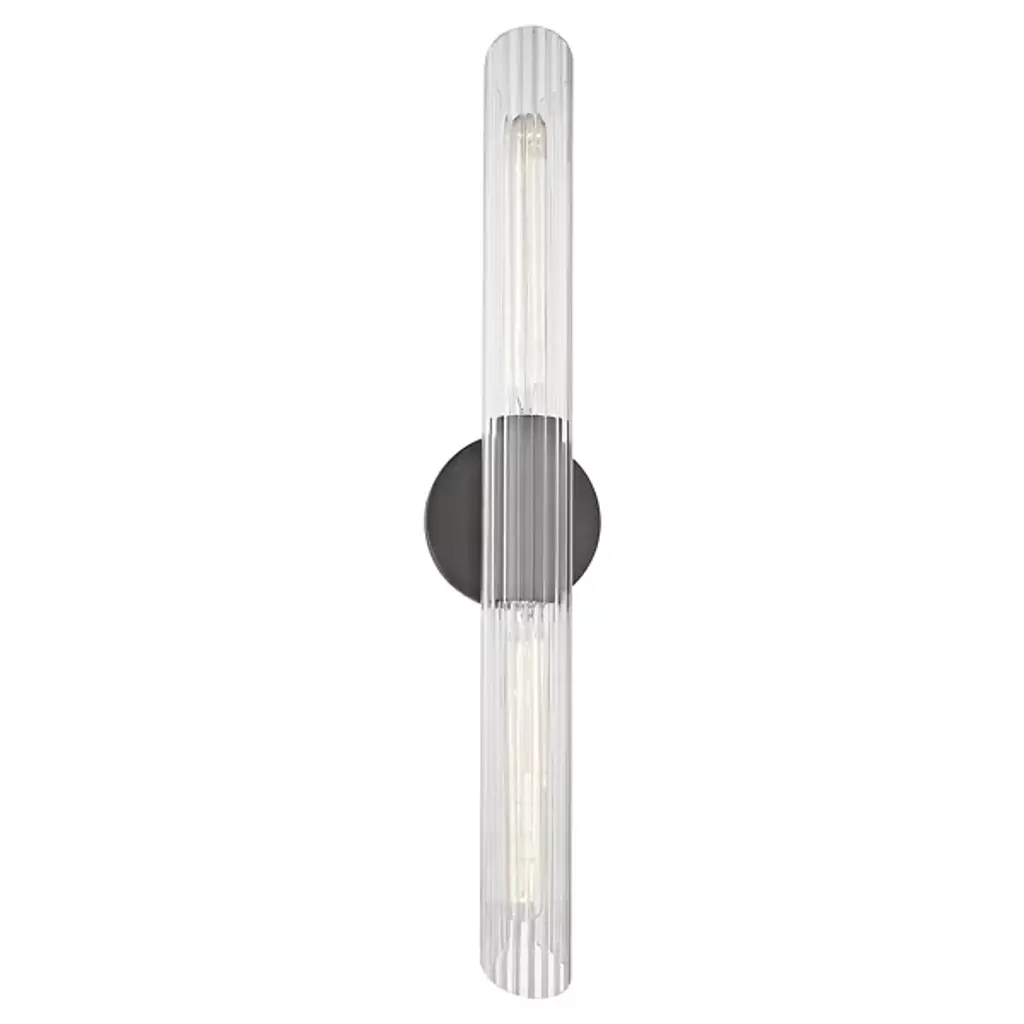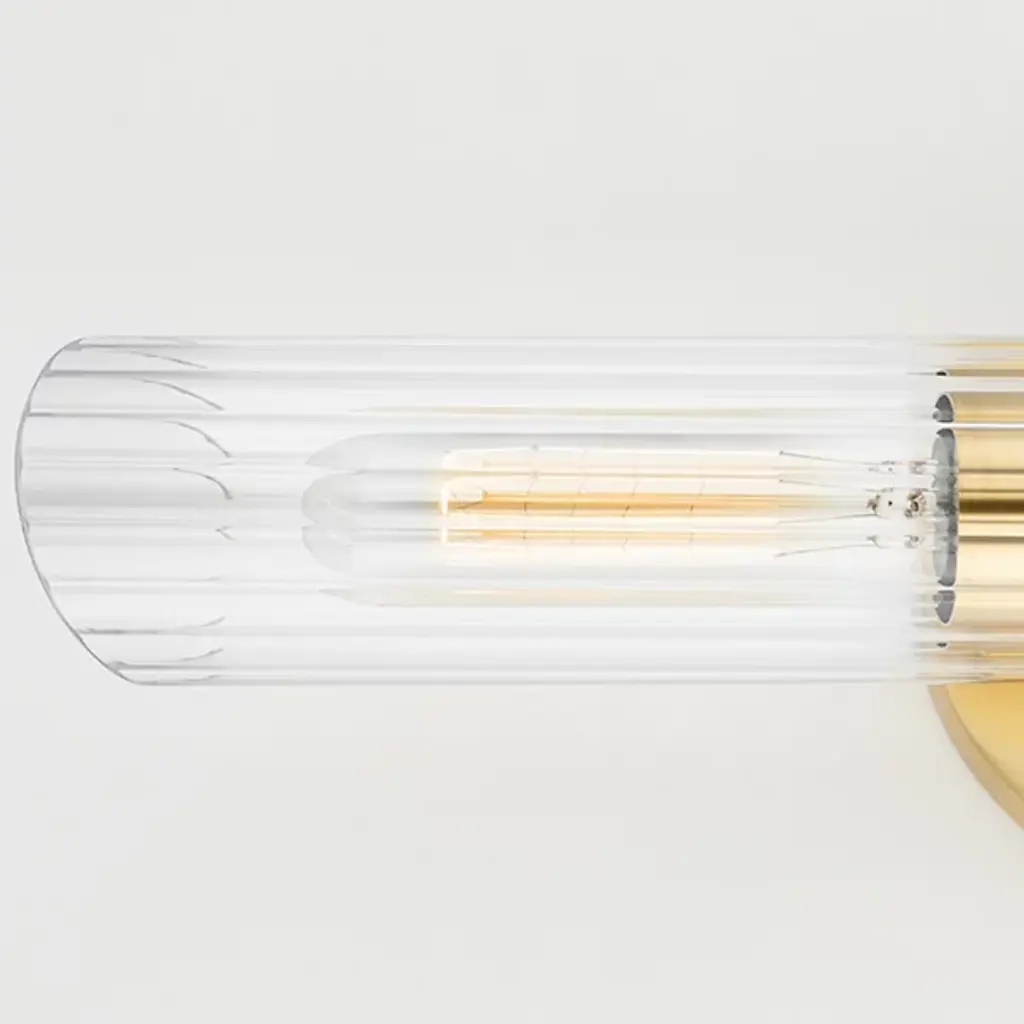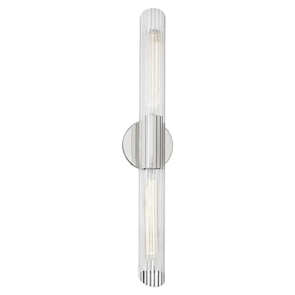 The Cecily Wall Sconce by Mitzi is the perfect blend of chic and contemporary. It features a fluted clear Glass cylinder shade with diagonal cuts on each end. A glossy Metal wall plate and spacer add just enough shine and 2 T10 lights provide charming light play. Install this wall light vertically or horizontally to personalize your lighting display.