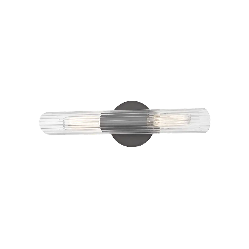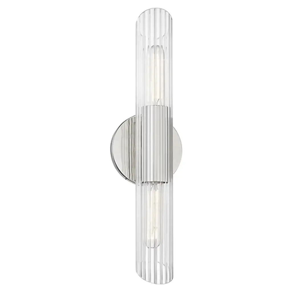 The Cecily Wall Sconce by Mitzi is the perfect blend of chic and contemporary. It features a fluted clear Glass cylinder shade with diagonal cuts on each end. A glossy Metal wall plate and spacer add just enough shine and 2 T10 lights provide charming light play. Install this wall light vertically or horizontally to personalize your lighting display.
