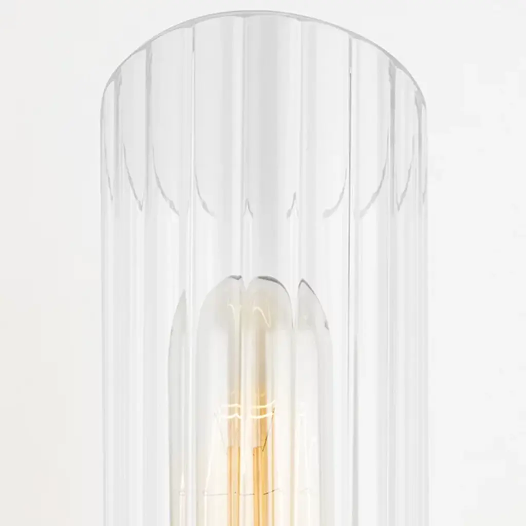 The Cecily Wall Sconce by Mitzi is the perfect blend of chic and contemporary. It features a fluted clear Glass cylinder shade with diagonal cuts on each end. A glossy Metal wall plate and spacer add just enough shine and 2 T10 lights provide charming light play. Install this wall light vertically or horizontally to personalize your lighting display.