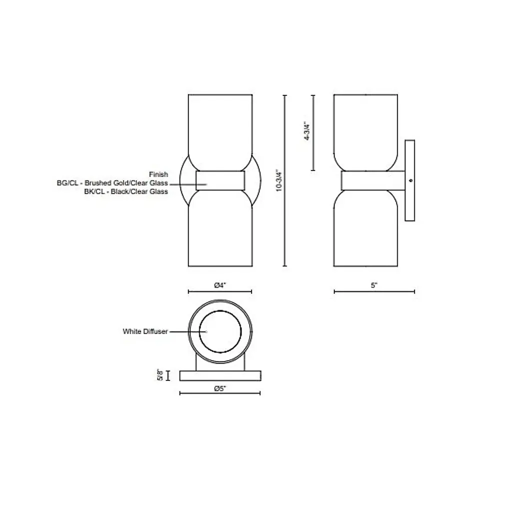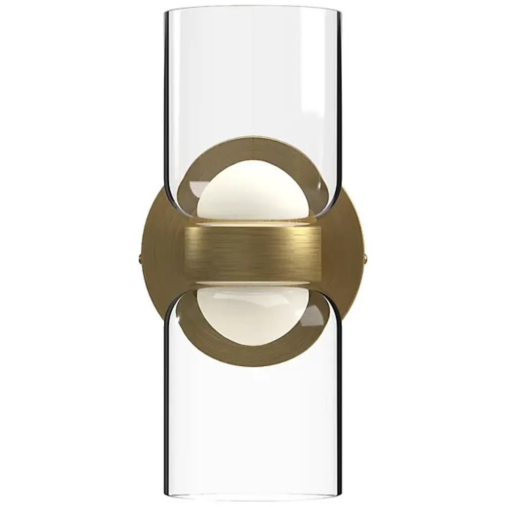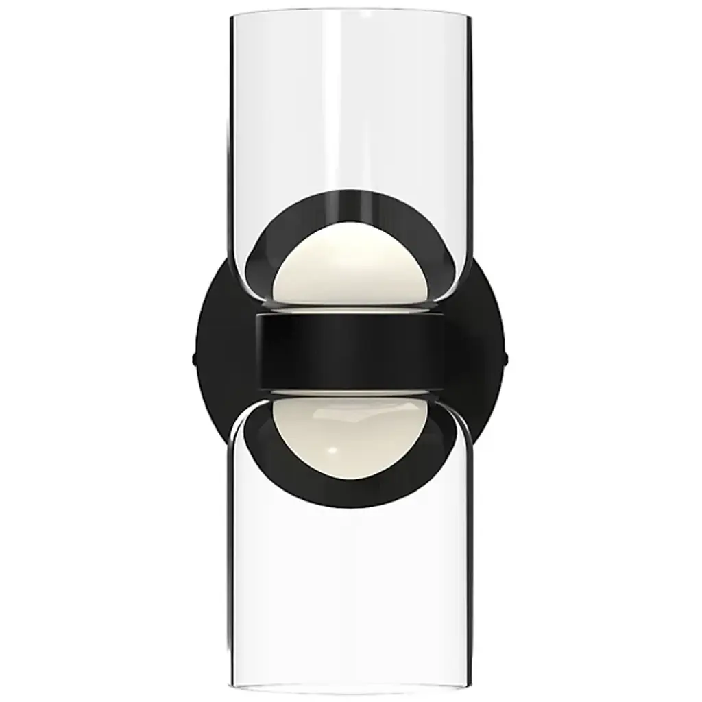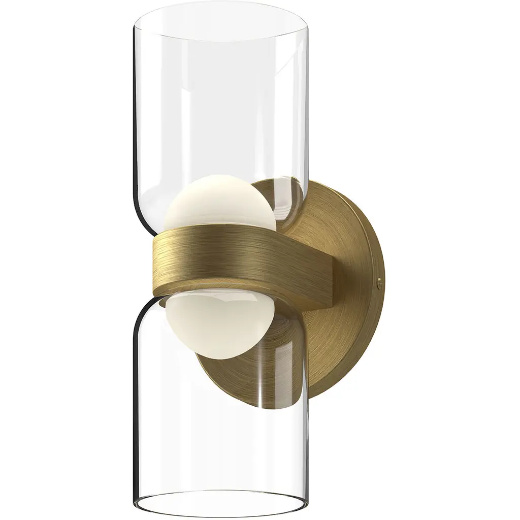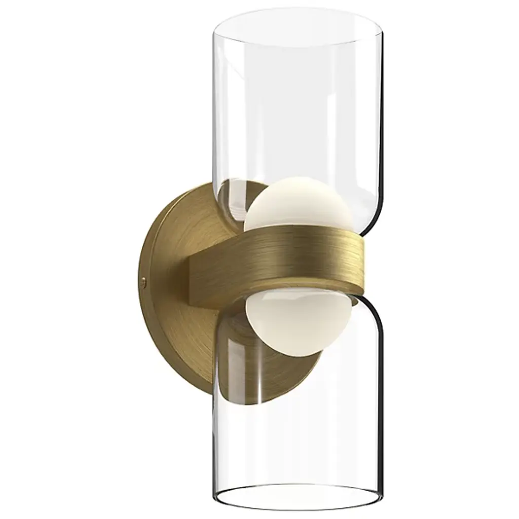 Add a touch of welcoming charm to indoor walls with the Cedar 2-Light LED Wall Sconce from Kuzco Lighting. The sconce starts with a compact aluminum disc wall plate. The wall plate extends curving hardware that holds energy-friendly LED lamping. The lamping is mellowed by a compound shade, juxtaposing translucent half-globe diffusers and clear glass cup shades that bloom upwards. The shades create a stylized hourglass that dispenses a warm ambiance around the fixture.