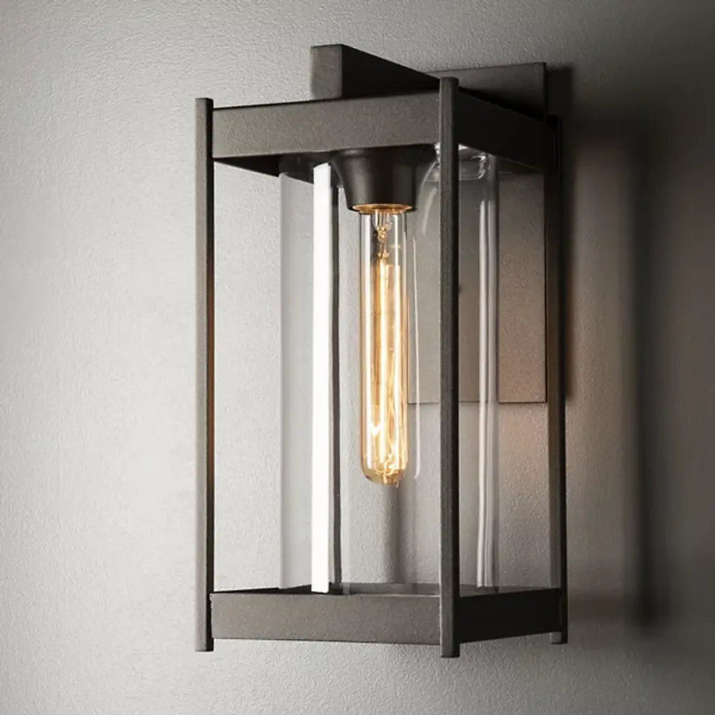 Time-honored lantern lighting, updated for modern exteriors. Designed by Paul Marr-Hilliard, the Cela Outdoor Wall Sconce by Hubbardton Forge showcases the archetypal vertical lines of a lantern as an open aluminum cage around the central cylindrical glass shade. The glass fully encircles and protects the bulb within from the elements, and it enables a bright wash of ambient light near an entryway, along a porch or on either side of a garage door.