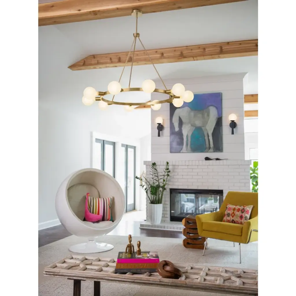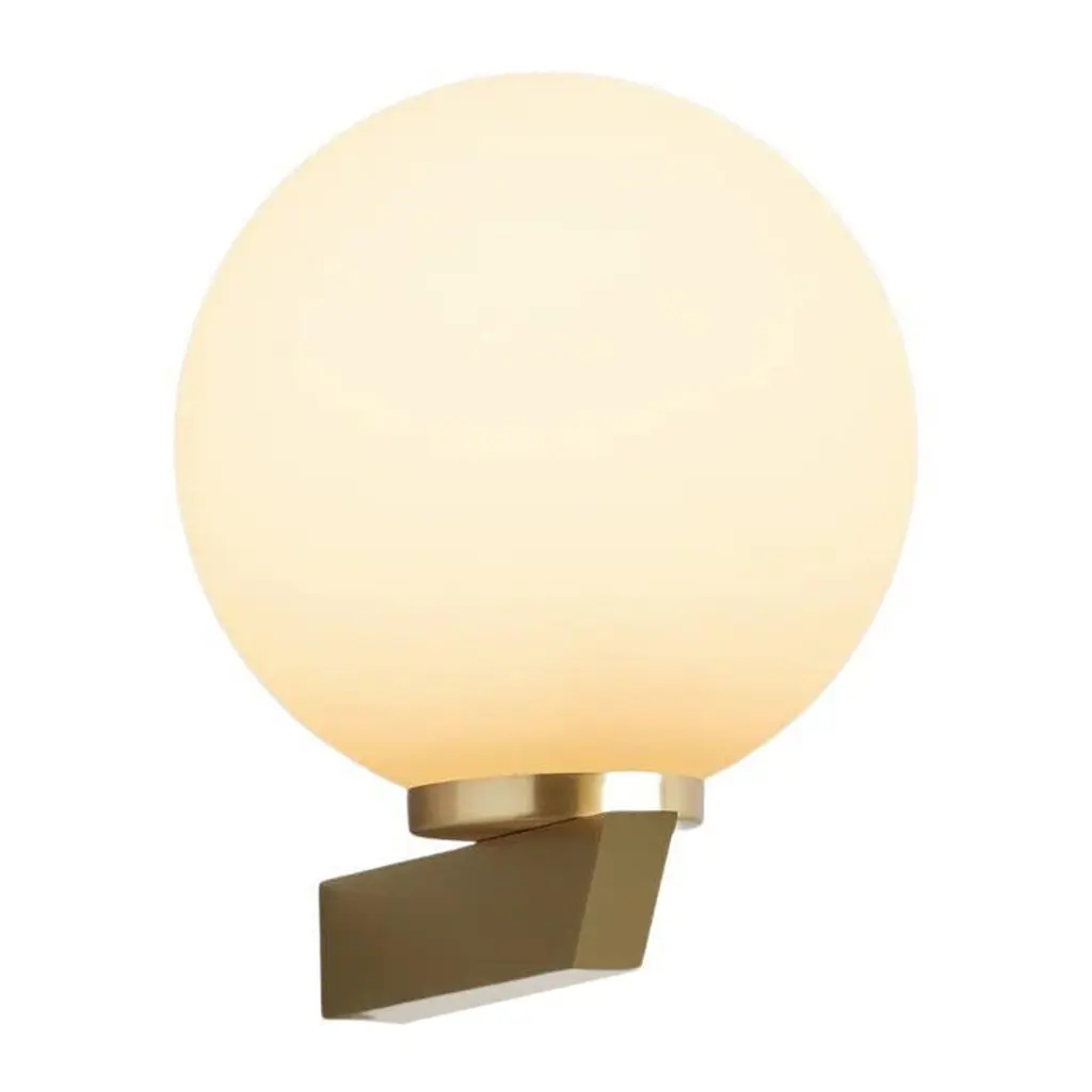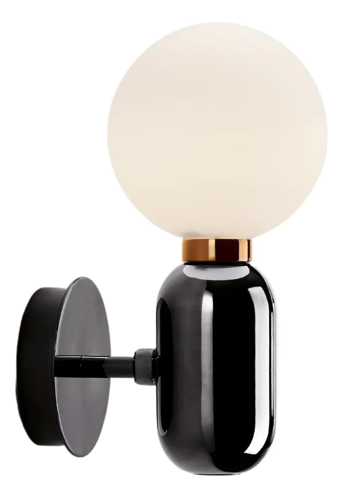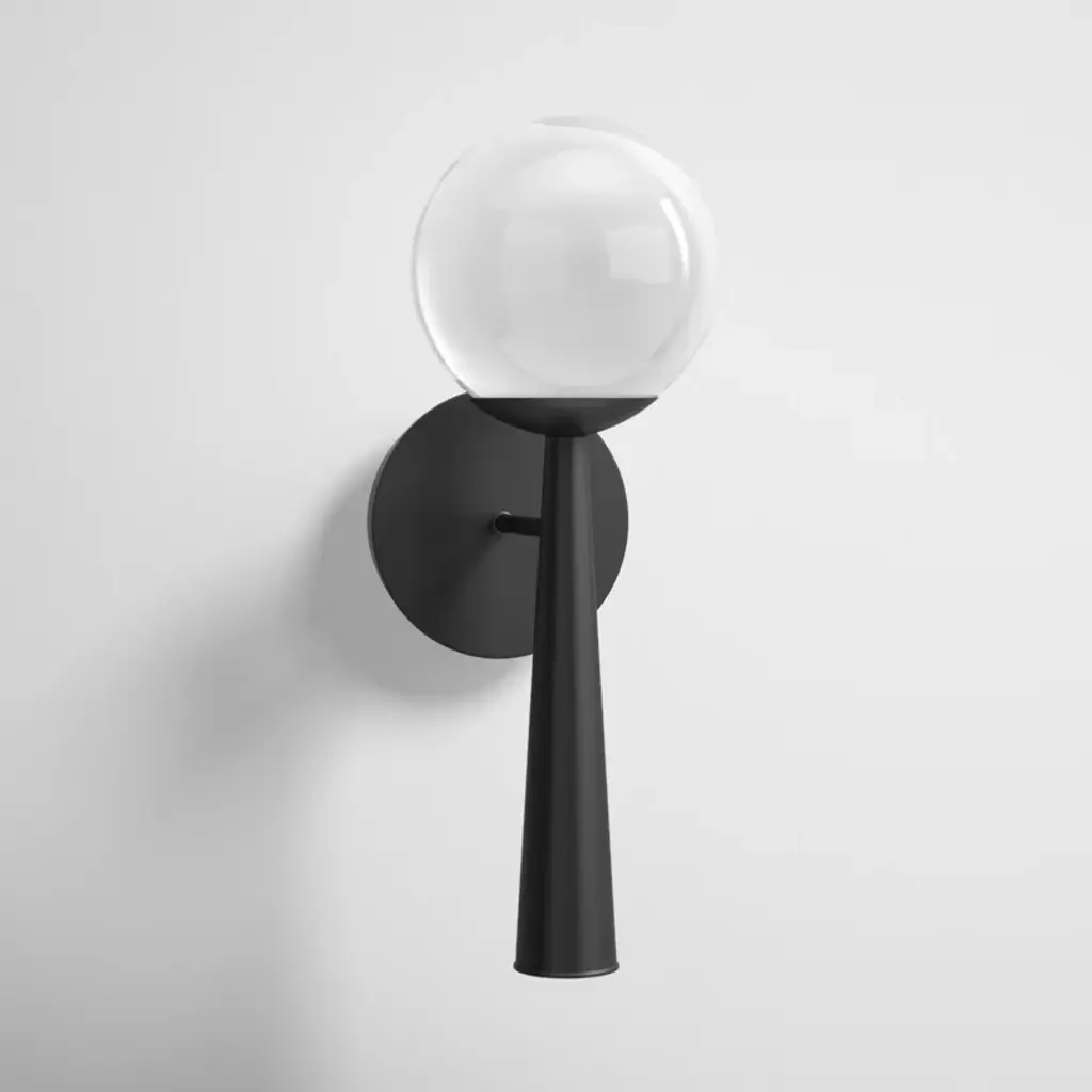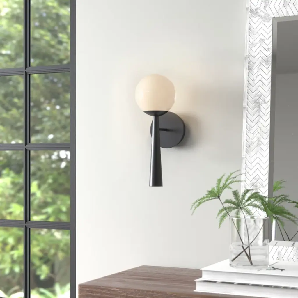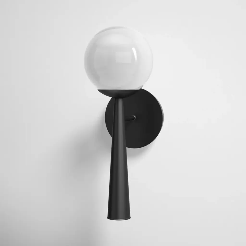 A single light sconce with a long tapered stem and Cased Opal globe create a unique, Mid-Century Modern silhouette. This versatile light fixture can be securely mounted up or down and includes an on/off button on the backplate. Choose to either hardwire the dimmable fixture or power via an optional Black fabric-covered cord. Dimmable, it is illuminated by (1) 5w Candelabra LED bulb (not included), creating a soft white glow. In classic Black or in a warm Lacquered Brass finish.
