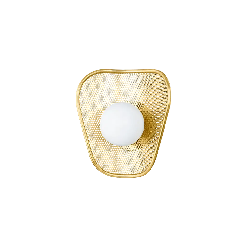 The Centric sconce blends vintage influence with bold geometry in a design that makes a timeless statement. A perforated metal shade nestles into a solid brass bowl, echoing the work of mid-century designers like Mathieu Mategot. Suited to modern or transitional interiors, this wall light brings textural interest and sculptural form to your space.