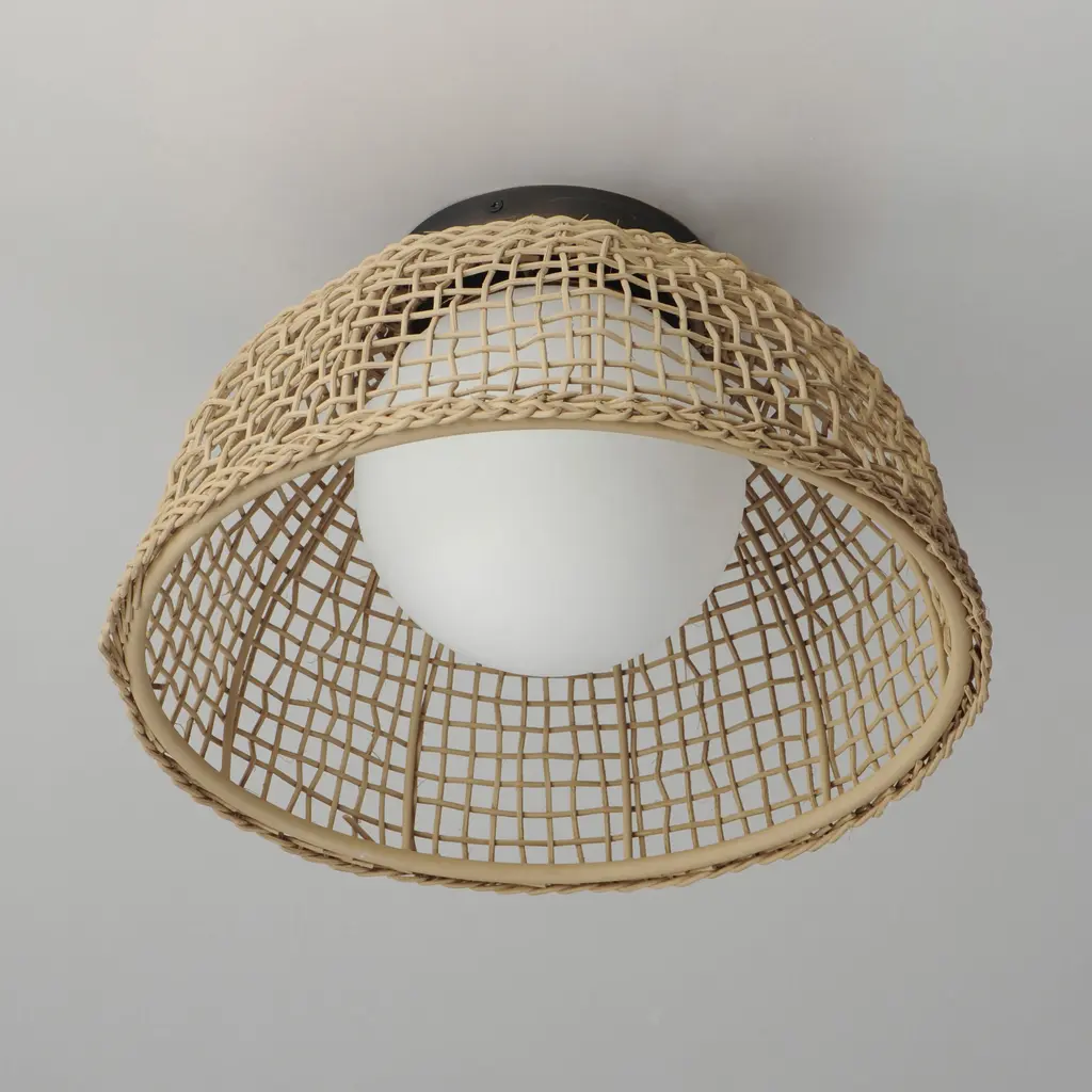 Hand-woven Natural Rattan blends casual comfort with impeccable craftsmanship. Further demonstrating the artisanal touch applied to this series, two hand-painted finish options either match Weathered White on both the rattan and its metal work or contrast Natural tones with an Antique Bronze finish. Choose from various scales of pendants where in some configurations a Satin White globe shade is included to diffuse the light source within. An ADA wall sconce completes the collection.