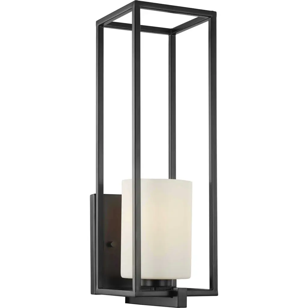 Stick with simple geometric forms and clean crisp lines with this modern wall bracket. A beautiful opal glass shade visually calms the sharp edges of the boxy frame in a masterful stroke of design excellence. The frame is coated in a classic black finish that contrasts the light shade. The light fixture is just right for spaces in need of a subtle, feminine touch.