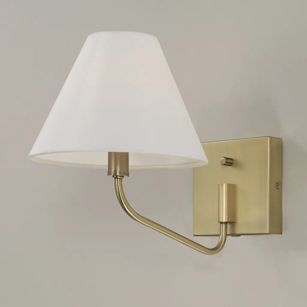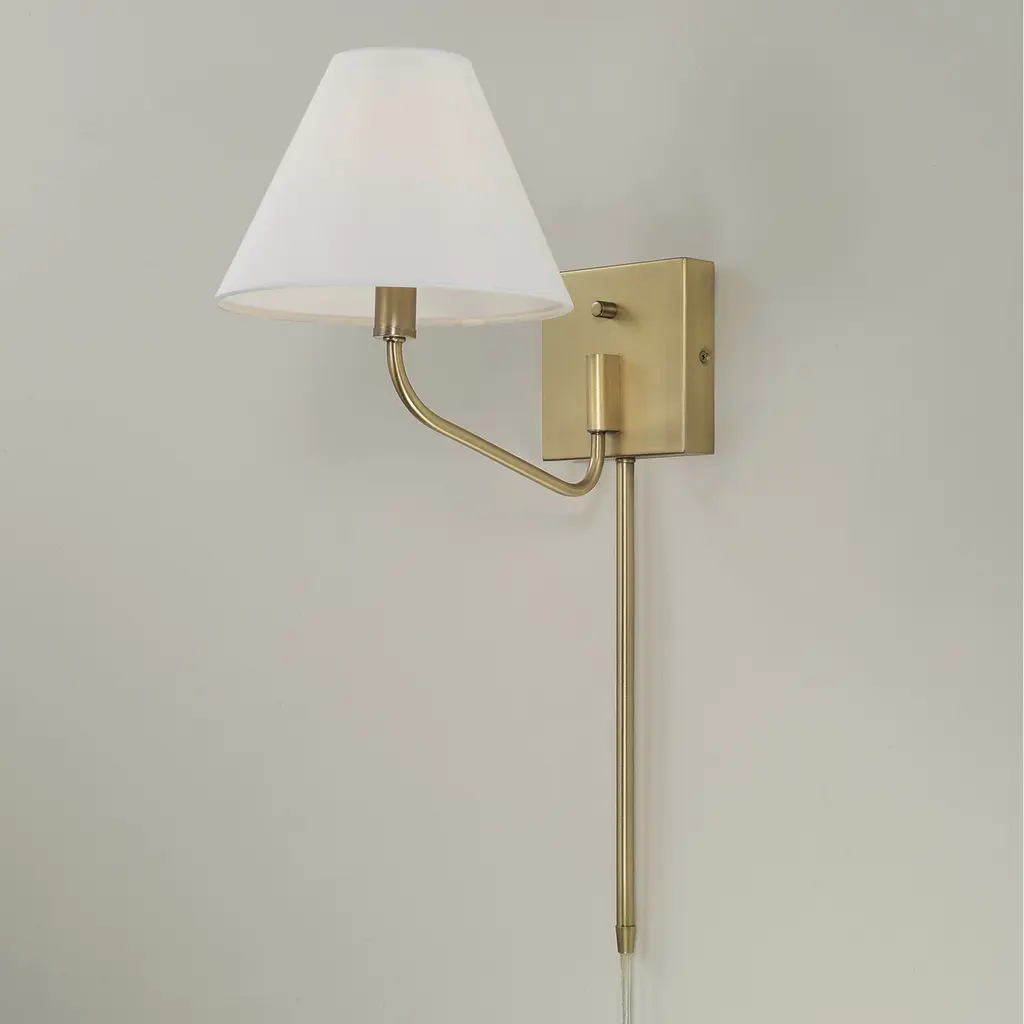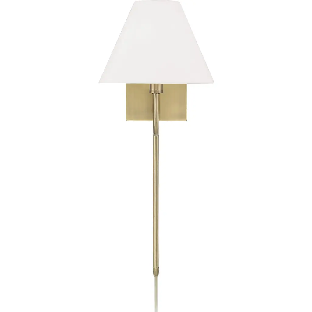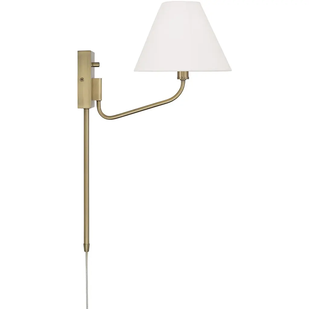 Soft angles and classic style create the Chadwick Sconce. The tapered White fabric shade brings a visual balance to the elegant, swiveling metal arm, finished in Aged Brass for a mid-century touch of shine. Includes a dimmer dial on the backplate and a plug-in option with 12 cord cover for effortless functionality.