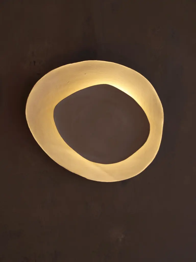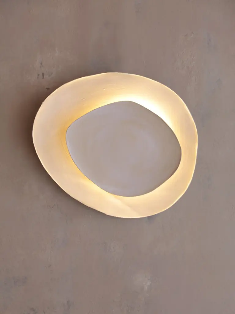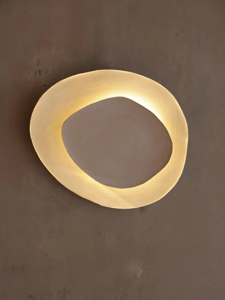 Chalk #1 wall light by Margaux LeycurasOne of a Kind, Signed and numberedDimensions: D 6 x W 46 x H 40cm Material: Ceramic, sand stoneware tops with a porcelain engobe finish.The piece is signed, numbered and delivered with a certificate of authenticity.The collection of unique pieces - illuminated wall sculptures – Eclipse, was born from the combination of an exploration of the ceramic material and its limits, and a desire to create pieces which elevate the space and contribute to create an atmosphere.All our lamps can be wired according to each country. If sold to the USA it will be wired for the USA for instance.Margaux Leycuras"My ceramic workshop is located in Bordeaux, France. It is dedicated to my ceramic practice. To make my line of dinnerware and sculptures, I use various traditional building techniques; such as the potter's wheel, slab and coil building. I only use high-temperature clays such as stoneware and porcelain. These clays are fired between 1230°c and 1300°c to reach their maturity and vitrify. The practice of ceramics requires patience: you have to learn to respect the material and the different stages of making process.".