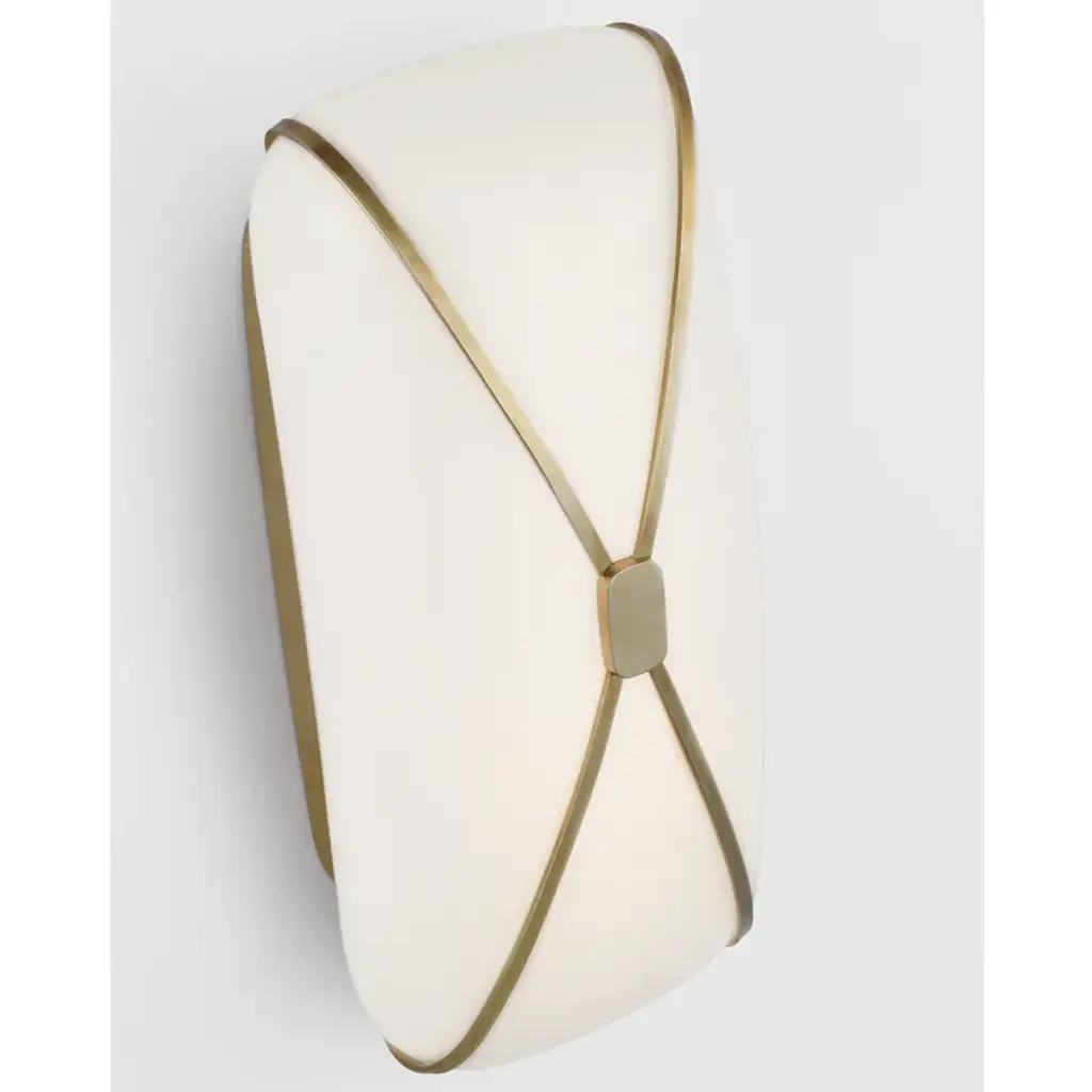 Inspired by the delightful dessert, the Fondant by Champalimaud presents luxurious designs. Sconces, flush mounts, and a table lamp in white glass are crisscrossed with gunmetal, brass, or nickel resembling confectionary string or icing. The various sizes can enhance larger areas or hallways but also work well alone or as a pair in more intimate spaces like a bathroom or vanity. Designer: Champalimaud Height: 13.5" Extension: 4.5" Backplate: 4.75" x 10.75" Rectangle Mounting: Hardwire Socket: Dedicated LED Wattage: 12w (1400lm) Safety Rating Location: Damp Assembly Required? Yes