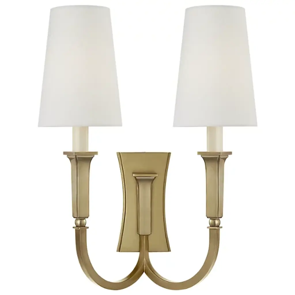 The Channing Double Wall Sconce from Visual Comfort Signature combines classic design with modern materials. Crafted from durable brass, this double wall sconce offers a timeless and elegant appearance. The two sconces extend from a central base, creating a balanced and sophisticated design. This sconce is not only a source of illumination but also a stylish addition to your living space. Designed by Thomas O'Brien, it reflects his commitment to merging timeless aesthetics with contemporary functionality. Illuminate your home with the perfect blend of classic and modern design.