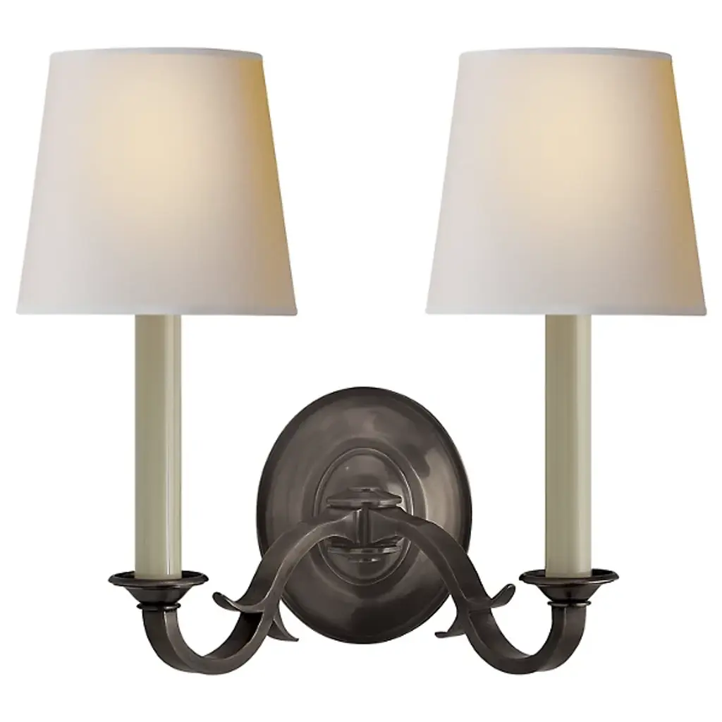 The Channing Double Wall Sconce from Visual Comfort Signature combines classic design with modern materials. Crafted from durable brass, this double wall sconce offers a timeless and elegant appearance. The two sconces extend from a central base, creating a balanced and sophisticated design. This sconce is not only a source of illumination but also a stylish addition to your living space. Designed by Thomas O'Brien, it reflects his commitment to merging timeless aesthetics with contemporary functionality. Illuminate your home with the perfect blend of classic and modern design.
