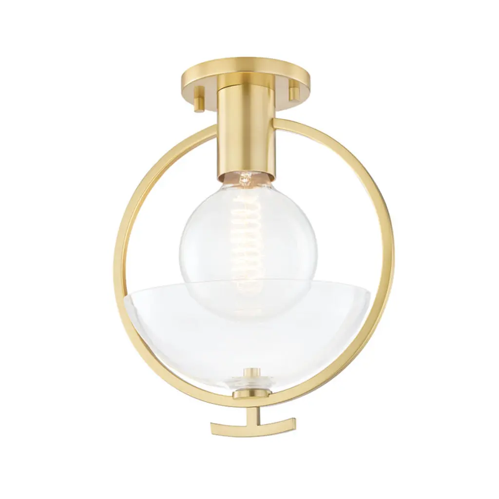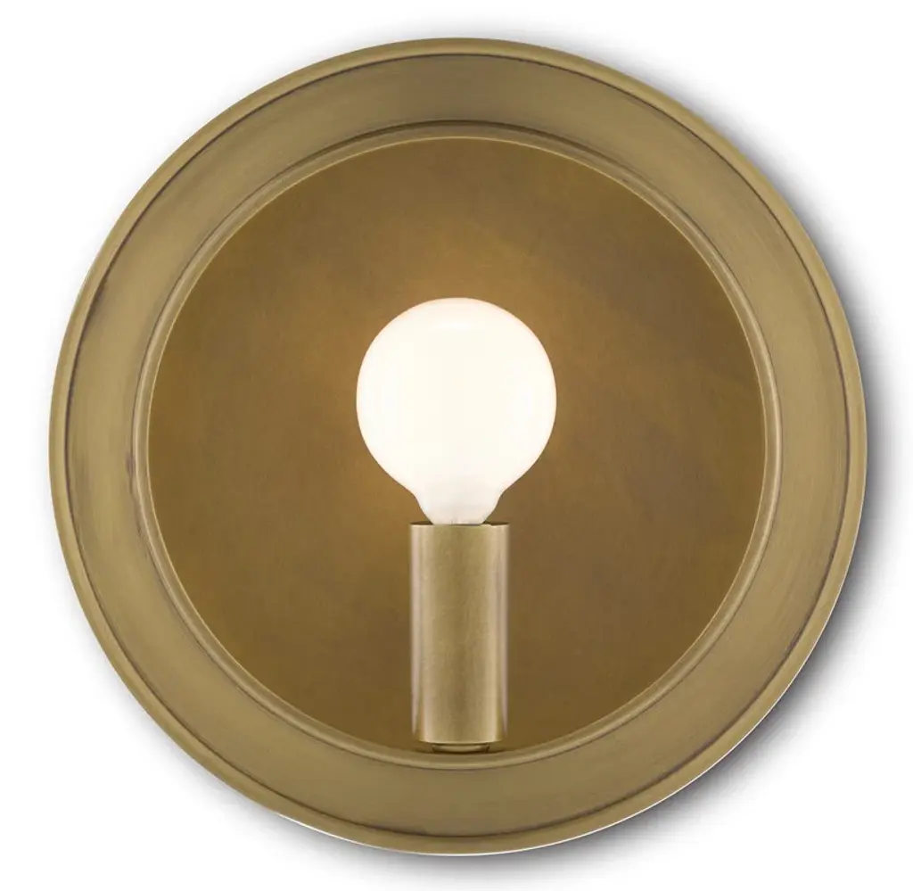 The Chaplet Brass Wall Sconce is a trickster, as it looks perfectly flat when viewed head-on but reveals its depth when seen from an angle. The round gold wall sconce in an antique brass finish has a matte warmth. We offer the Quadrato in two finishes as square alternatives to this sconce.