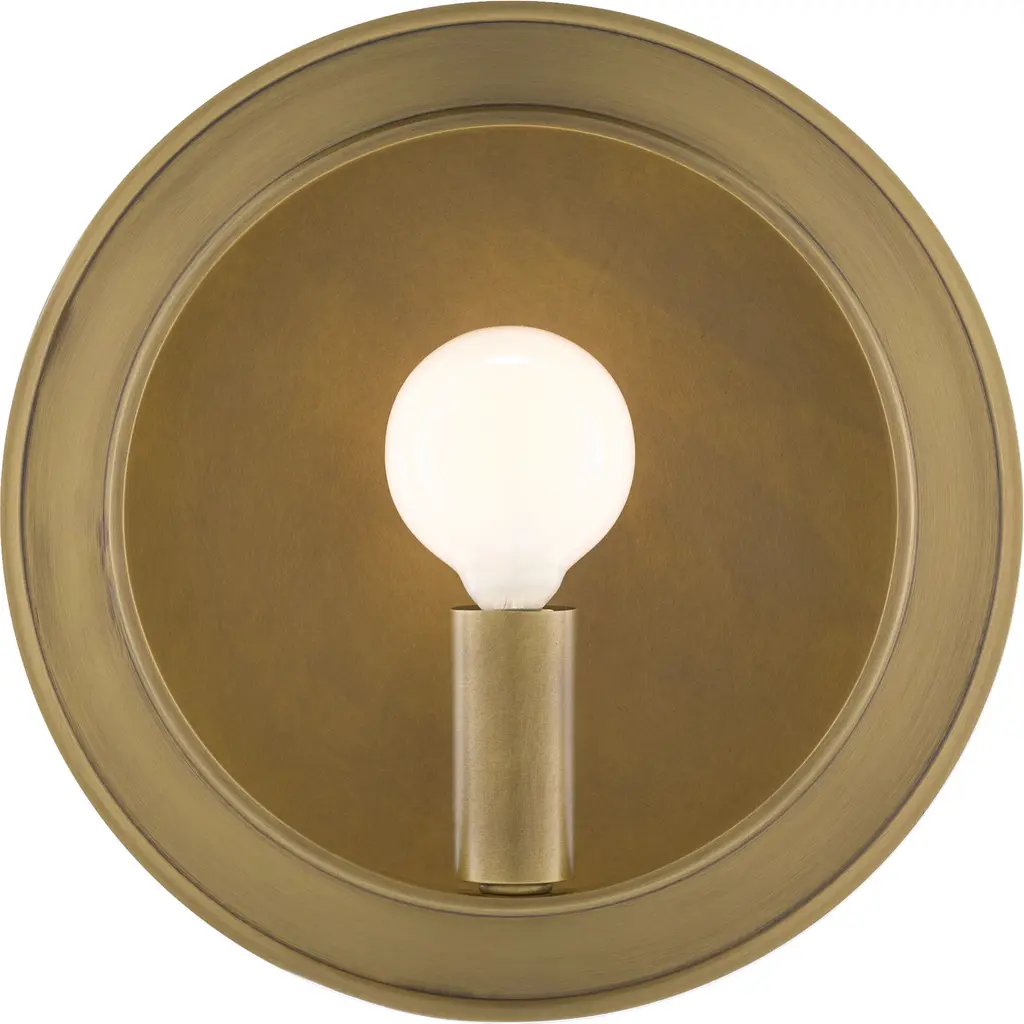 The Chaplet Brass Wall Sconce is a trickster, as it looks perfectly flat when viewed head-on but reveals its depth when seen from an angle. The round gold wall sconce in an antique brass finish has a matte warmth. We offer the Quadrato in two finishes as square alternatives to this sconce.